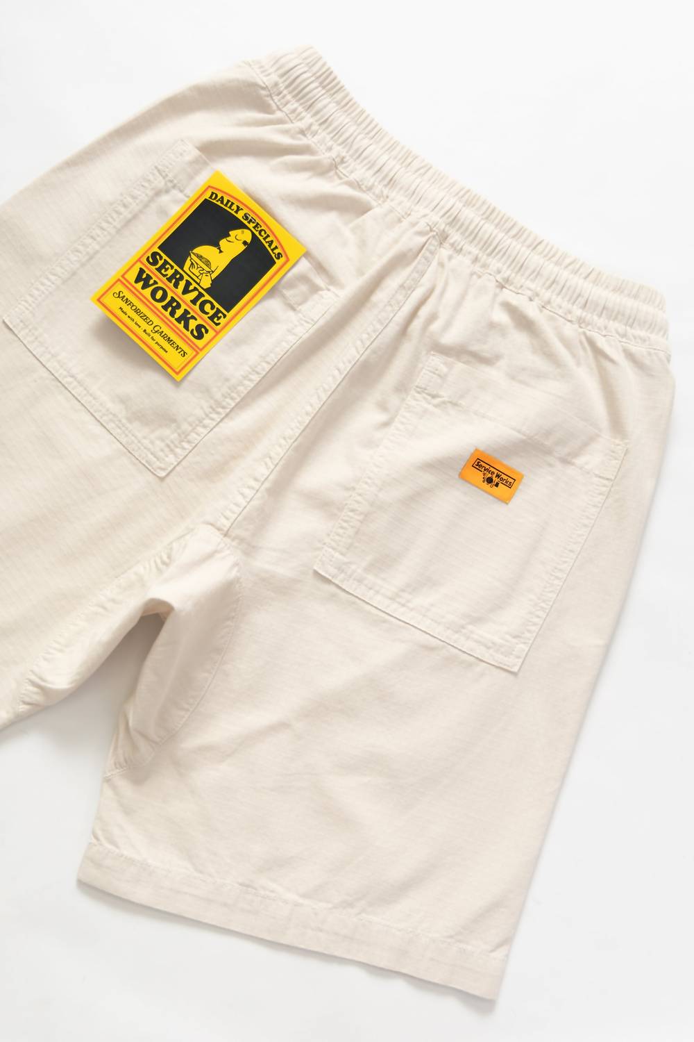 The Men's Ripstop Chef Short by Service Works is a stylish choice for any summer occasion. Crafted from 100% cotton, these shorts offer a solid pattern in a classic bone color. With a convenient button closure and functional pockets, they provide both comfort and practicality. Care is easy with machine wash and tumble dry instructions, making them a versatile addition to your streetwear wardrobe.