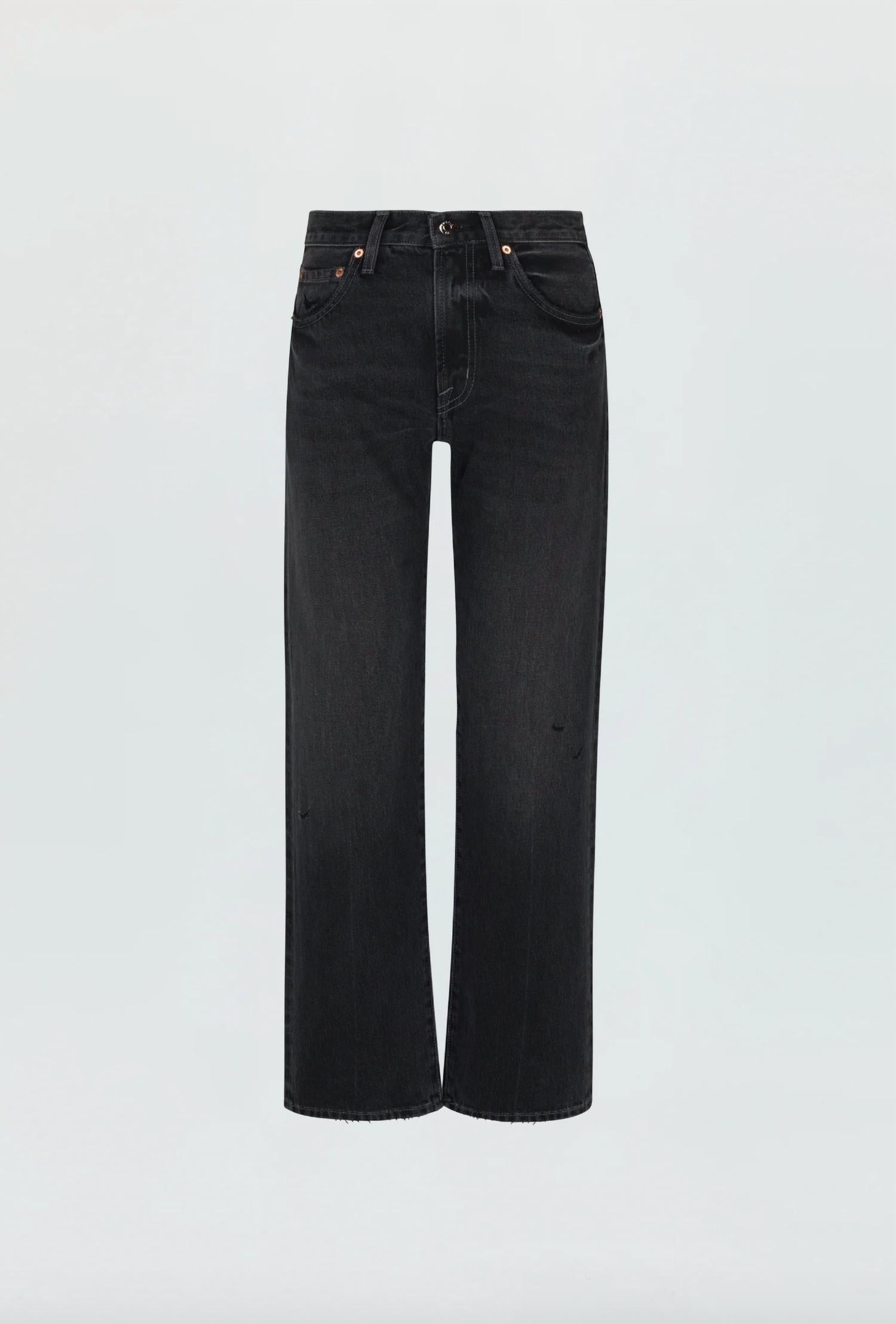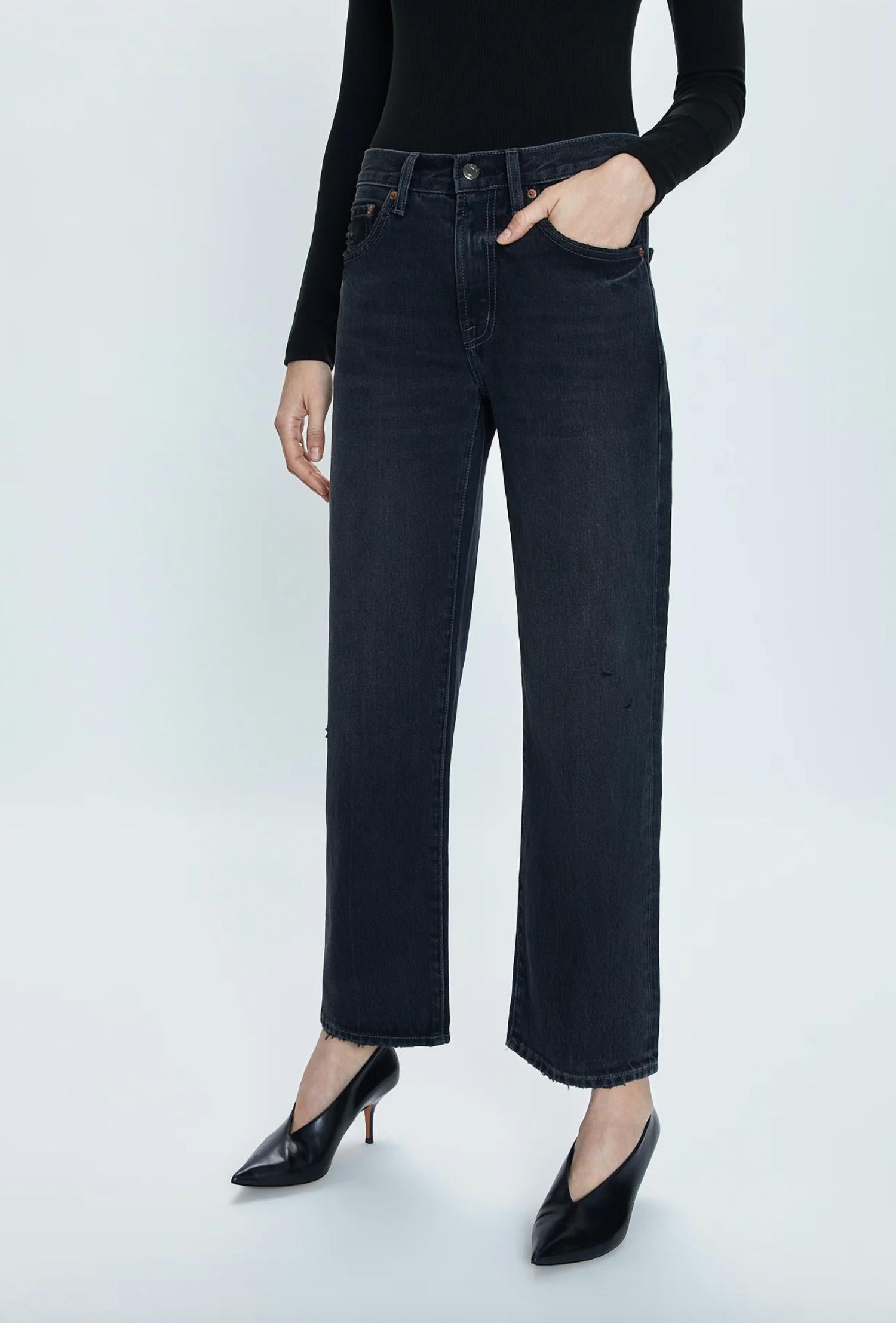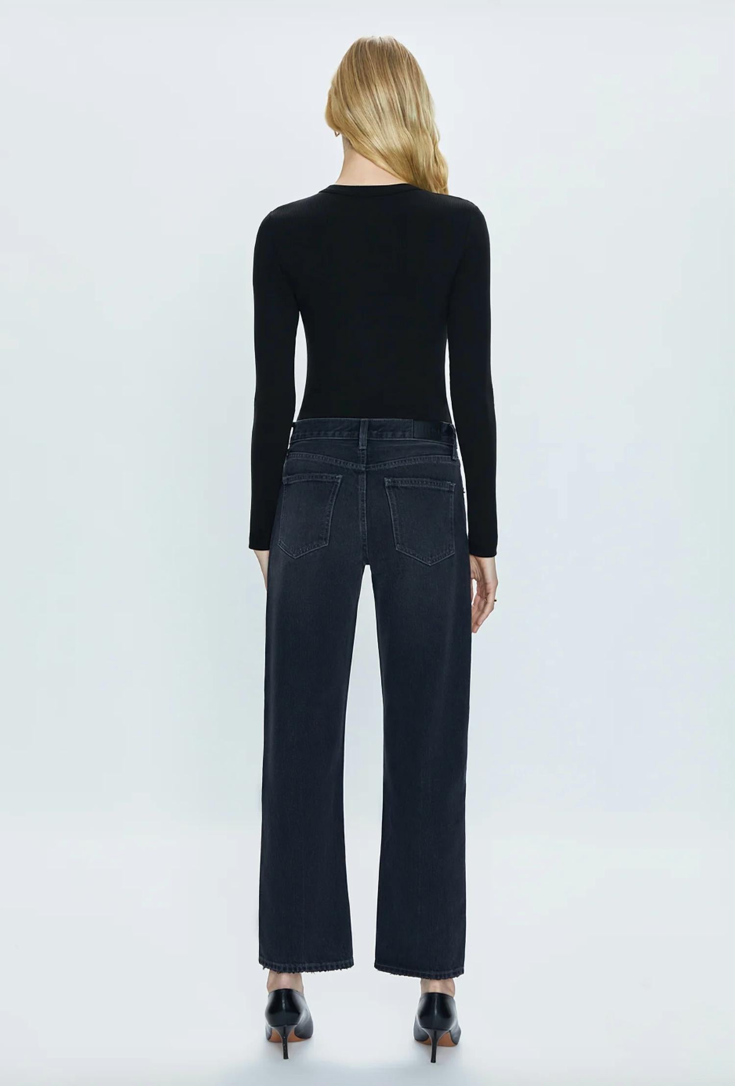 A perfectly tailored straight leg that you'll want in every color! Introducing the Women's Lexi Mid Rise Bowed Straight Denim by PISTOLA, a stylish piece in Mercury, a washed black denim with contrast hardware. Designed with a zip closure and mid-rise fit, this straight leg silhouette features ankle length crop and bowed knees for a unique barrel leg shape. Crafted from 100% Polyurethane, these pants present a rigid, non-stretch finish for a classic fit. For a precise fit, it is recommended to size down. Measurements include a 10” rise, 29” inseam, and 17 1/2” leg opening.
