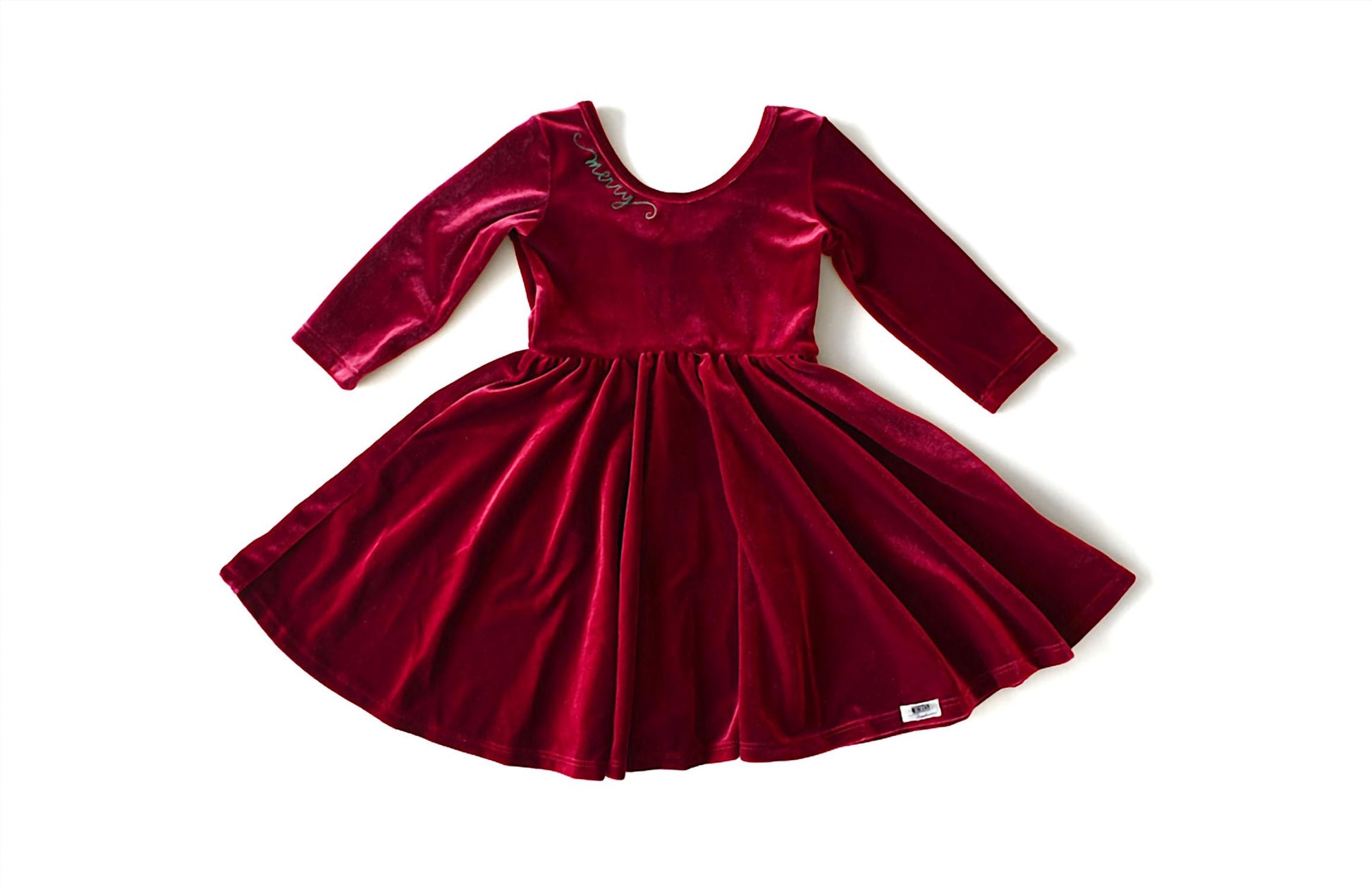 Celebrate the holidays with the Worthy Threads Christmas Holiday Twirly Dress, perfect for festive gatherings and photos with Santa. This girls' dress is crafted from soft stretch burgundy velvet and features 'Merry' embroidered on the neckline. Designed for winter holiday parties, this solid pattern dress boasts a charming twirl design. Care for this beautiful piece by dry cleaning only.