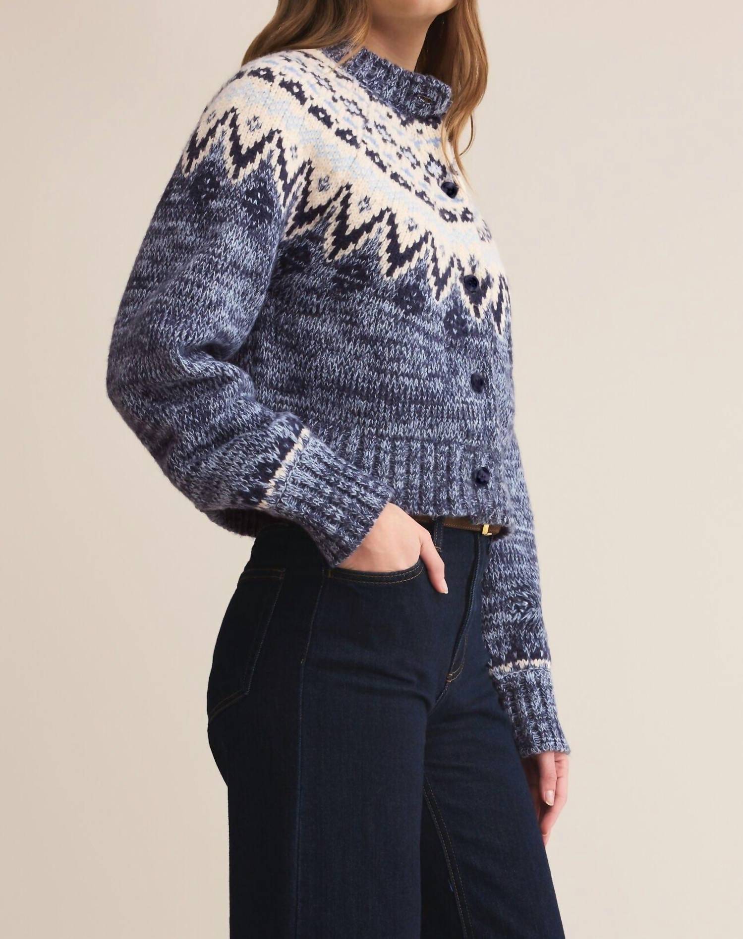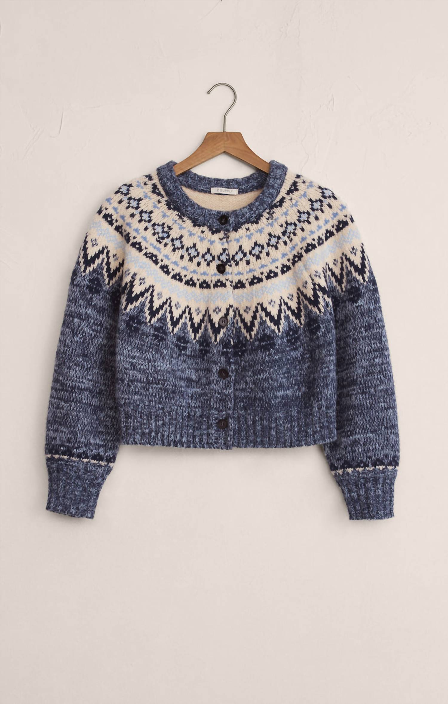 Throw this adorable cardigan over any cami or tank top. Introducing the North Sea Fairisle Cardigan by Z Supply, a chic choice for cozy winter layering. This patterned cardigan in Blue Velvet Heather features long sleeves, crafted from 100% polyester, and offers a comfortable wear with its midweight, heavy soft wash. Measuring 20" from the shoulder, it boasts a button closure that complements its crew neckline, making it an ideal addition to your travel ensembles. Care instructions recommend hand washing and laying flat to dry to maintain its soft, worn-in feel.