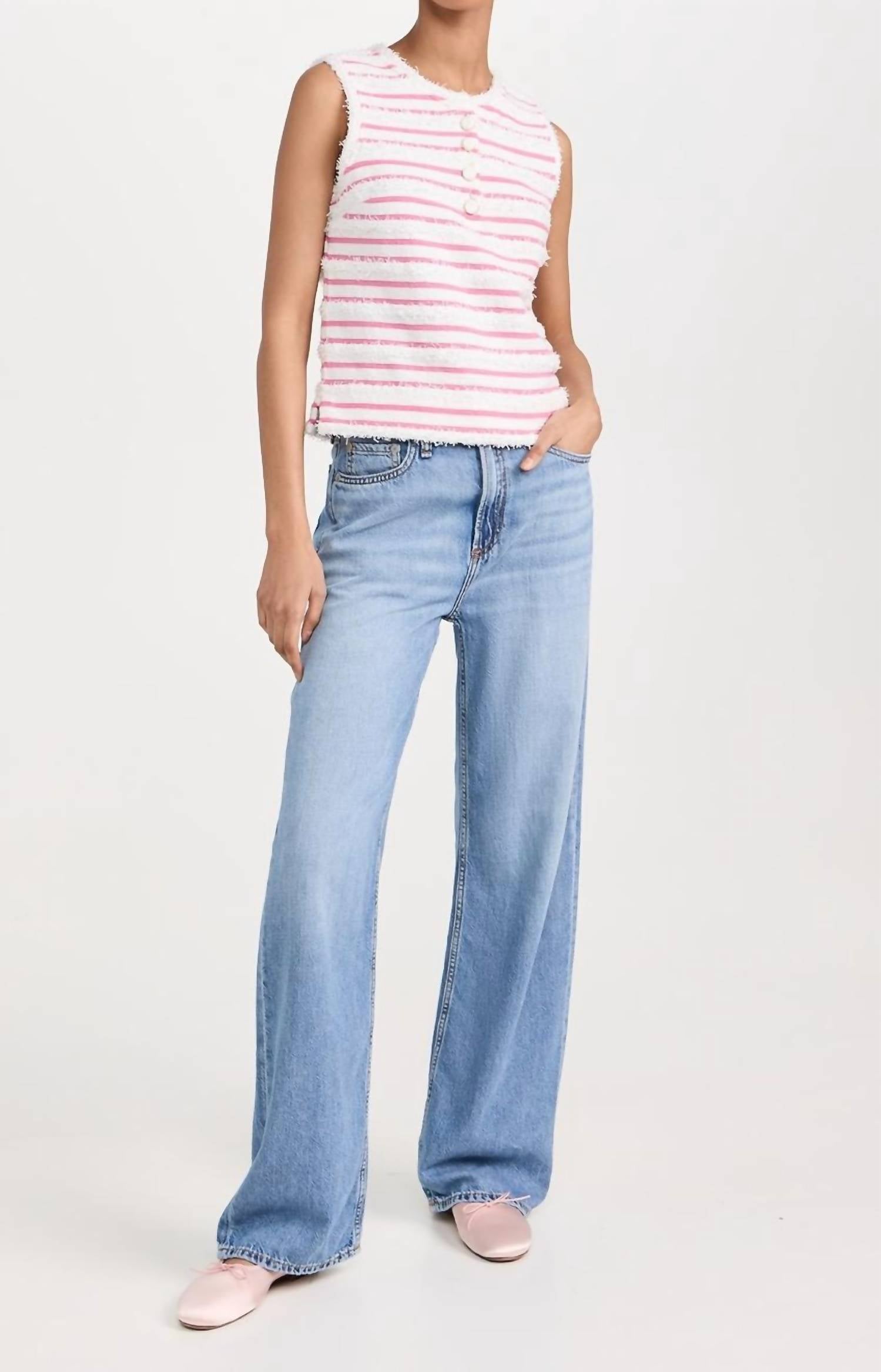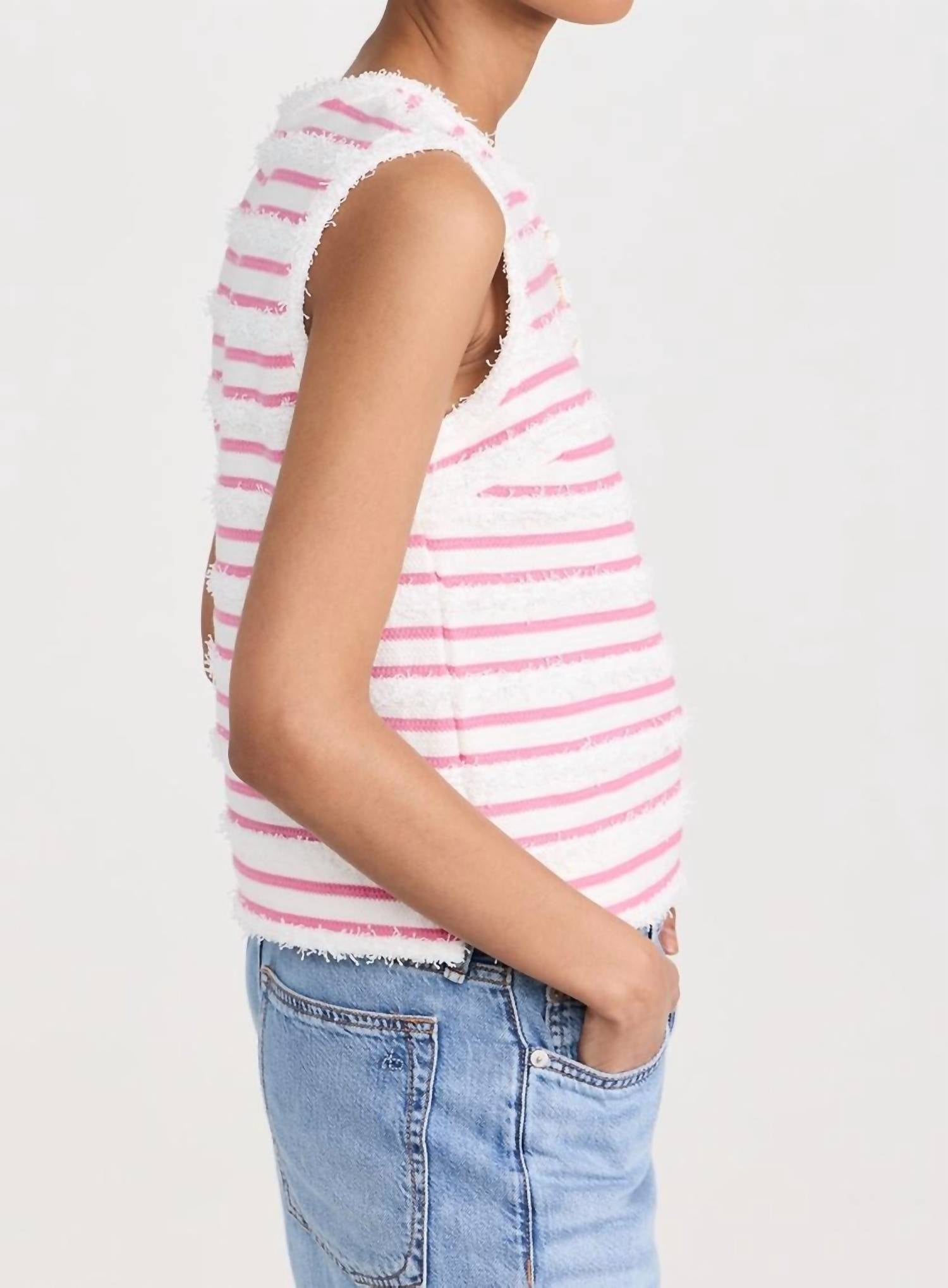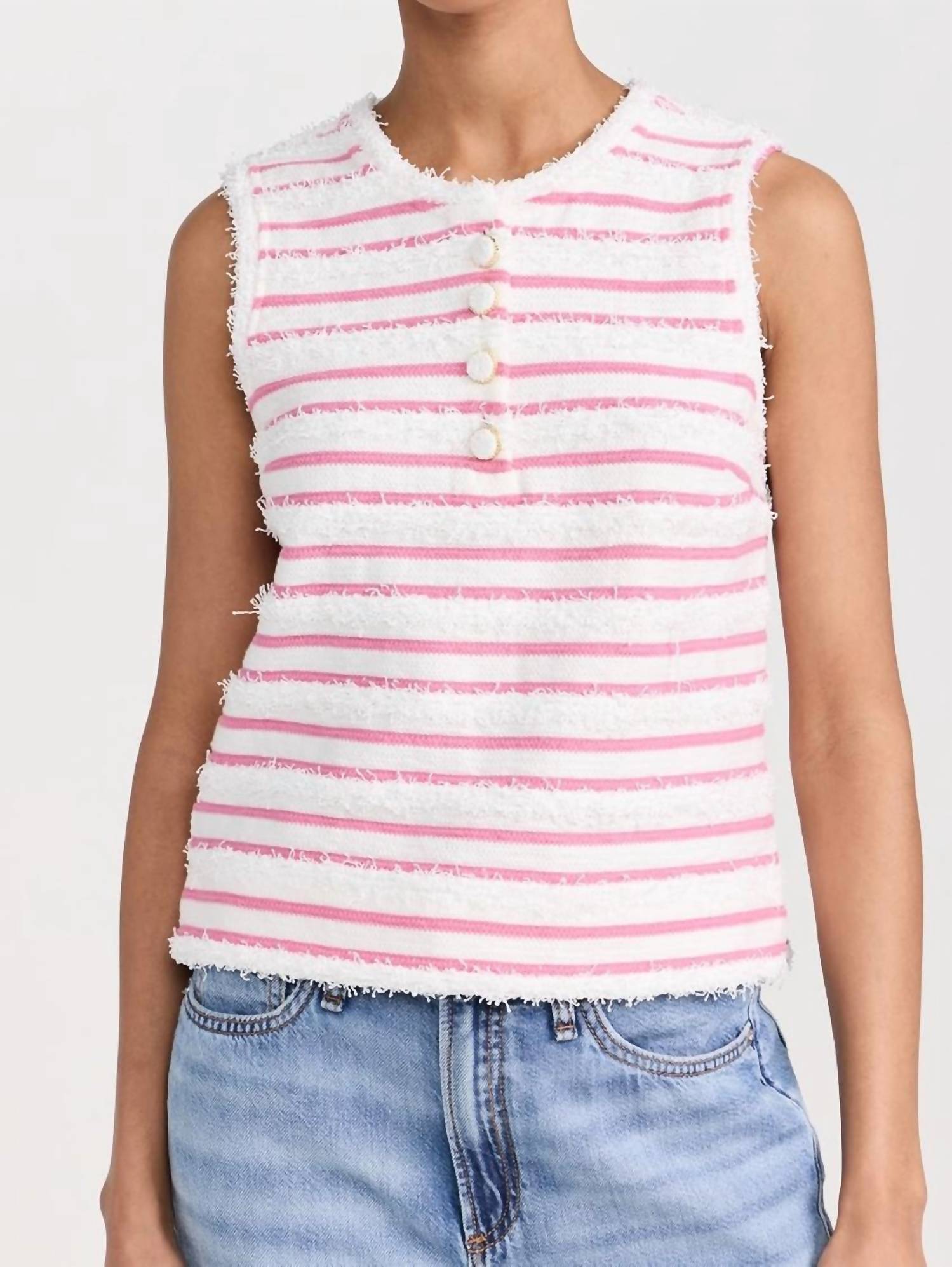 Fit, fabric and functionality. This tank top checks all the boxes. Introducing the Fringe Striped Top by 2.7 August Apparel, a chic addition to your wardrobe in a delightful white and pink palette. This sleeveless tank top features a round neckline and a stylish partial button placket, adorned with a striped pattern and frayed trim for a fashionable edge. Crafted from a mid-weight knit with a composition of 65% cotton and 35% polyester, it is designed for both style and comfort. Originating from China, this top is best cared for by hand washing to maintain its quality.