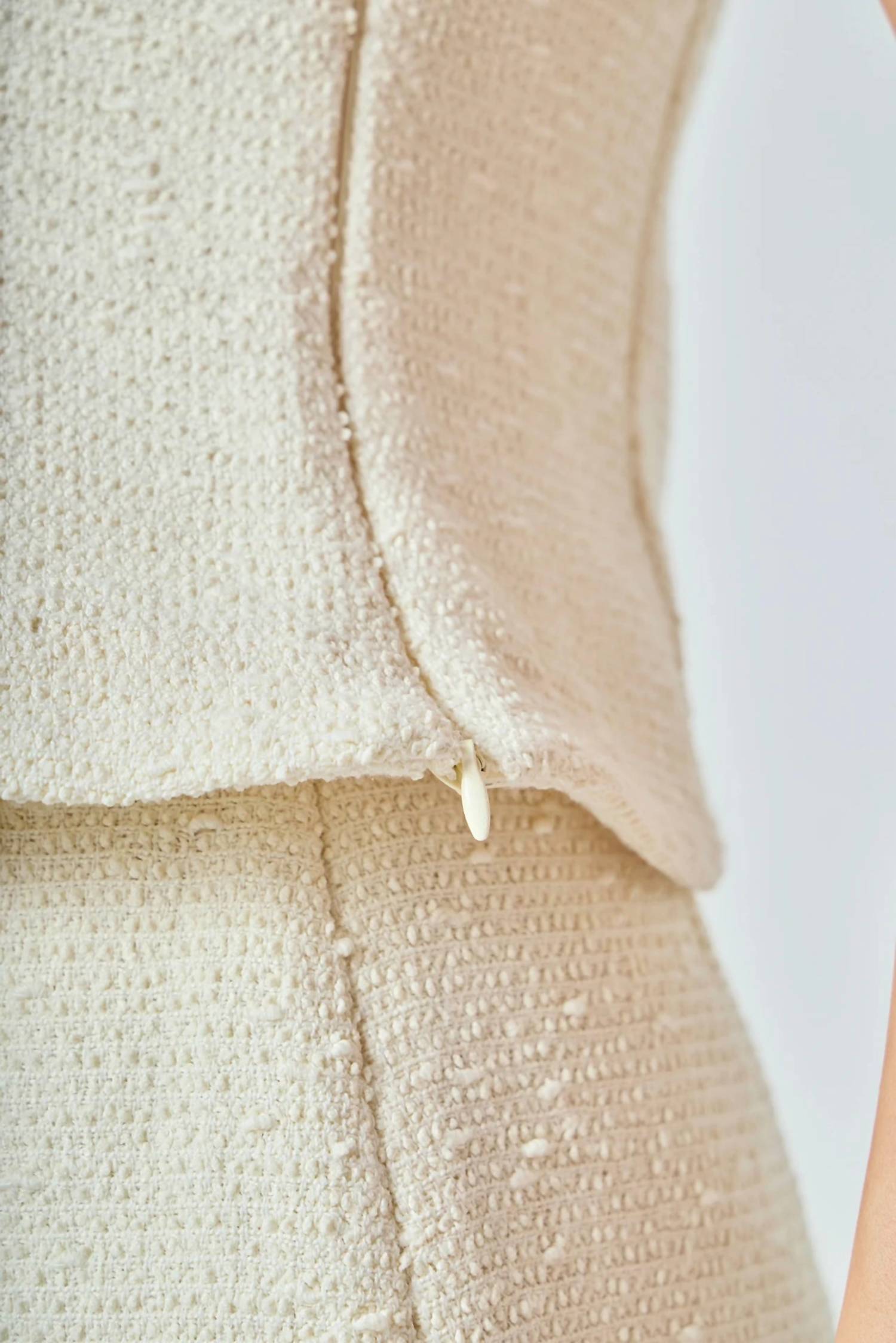 Fit, fabric and functionality. This tank top checks all the boxes. Introducing the Tweed Skinny Strap Tank Top by 2.7 August Apparel, a chic addition to your wardrobe in elegant ivory. This sleeveless tank features a textured scoop neckline and a fitted silhouette, perfect for layering or wearing solo. Composition includes a shell of 90% Polyester and 10% Cotton with a 100% Polyester lining, and it secures with a convenient side zip closure. For care, simply hand wash cold, avoid bleach, and iron on low for best results.