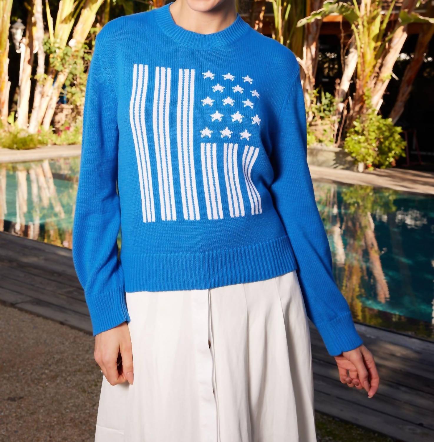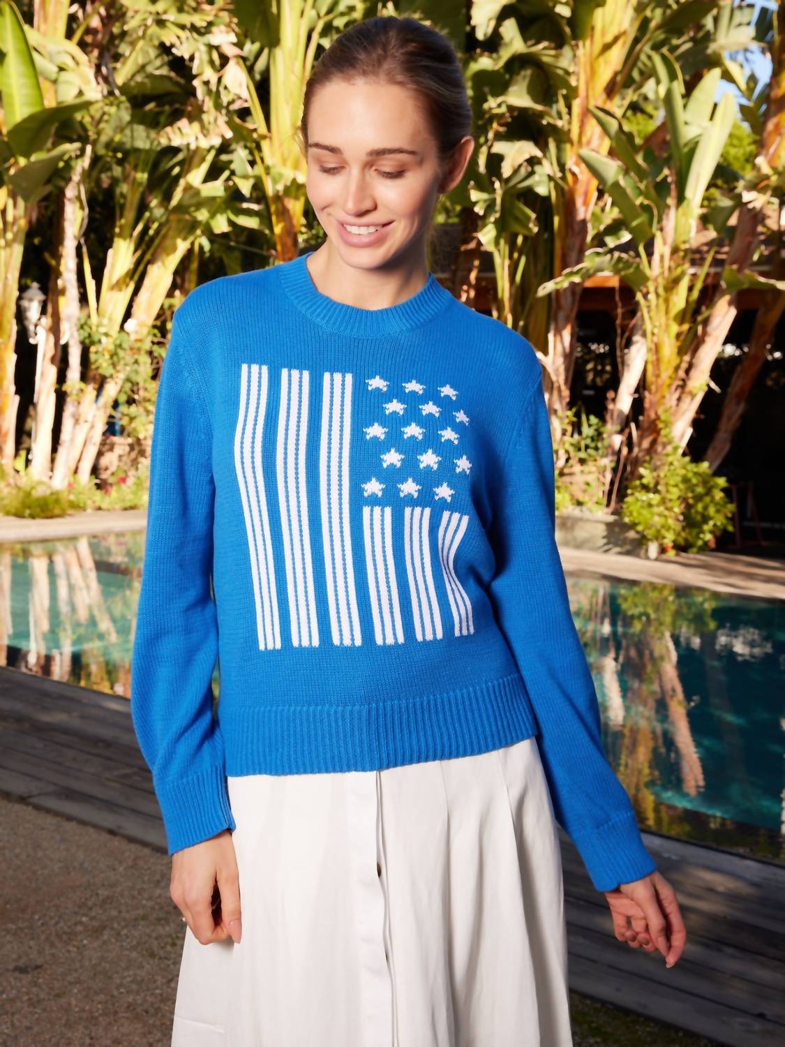 The ultimate go-to sweater, expertly crafted to provide the perfect combination of warmth and style. Its classic design and soft fabric make it a must-have addition to your wardrobe. Celebrate patriotic style with the long sleeve Freedom Sweater by 27 Miles Malibu. Crafted from cotton, this crewneck knit features a striking multi-pattern blend of vertical stars-and-stripes in crisp white, black accents. Its pull-on closure makes it effortlessly wearable for summer occasions like 4th of July celebrations or vacation outings. With its bold design, it's the perfect blend of statement-making and everyday versatility for women 30+.
