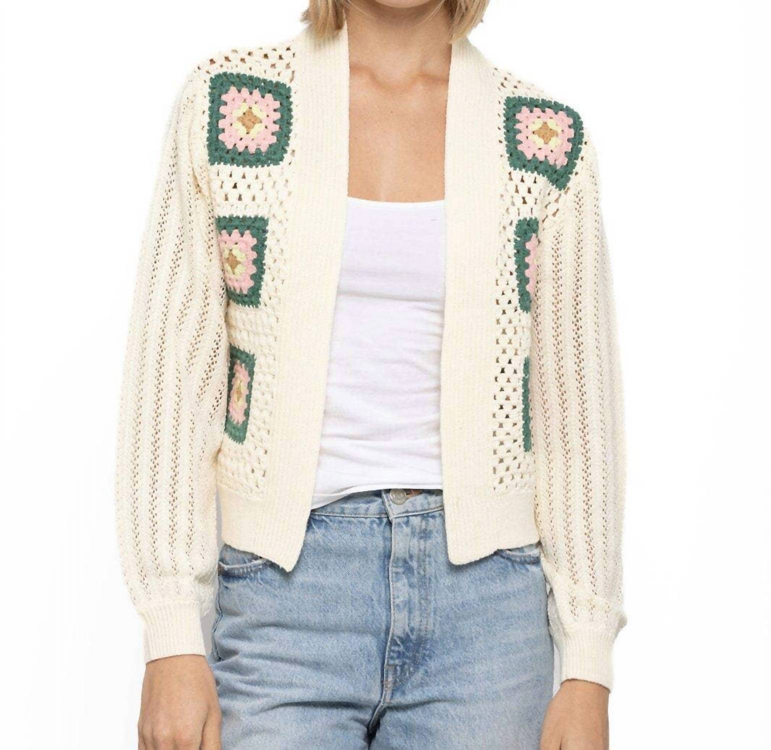 A classic fit that works just as good buttoned as it does left open. Featuring long sleeves and crafted from 100% cotton, this cardigan ensures a soft and cozy feel. The boxy cropped silhouette is complemented by intricate geometric crochet squares on the front, adding a touch of vintage charm. Pull-on. Hand wash. Garment length: 20.25 inches.