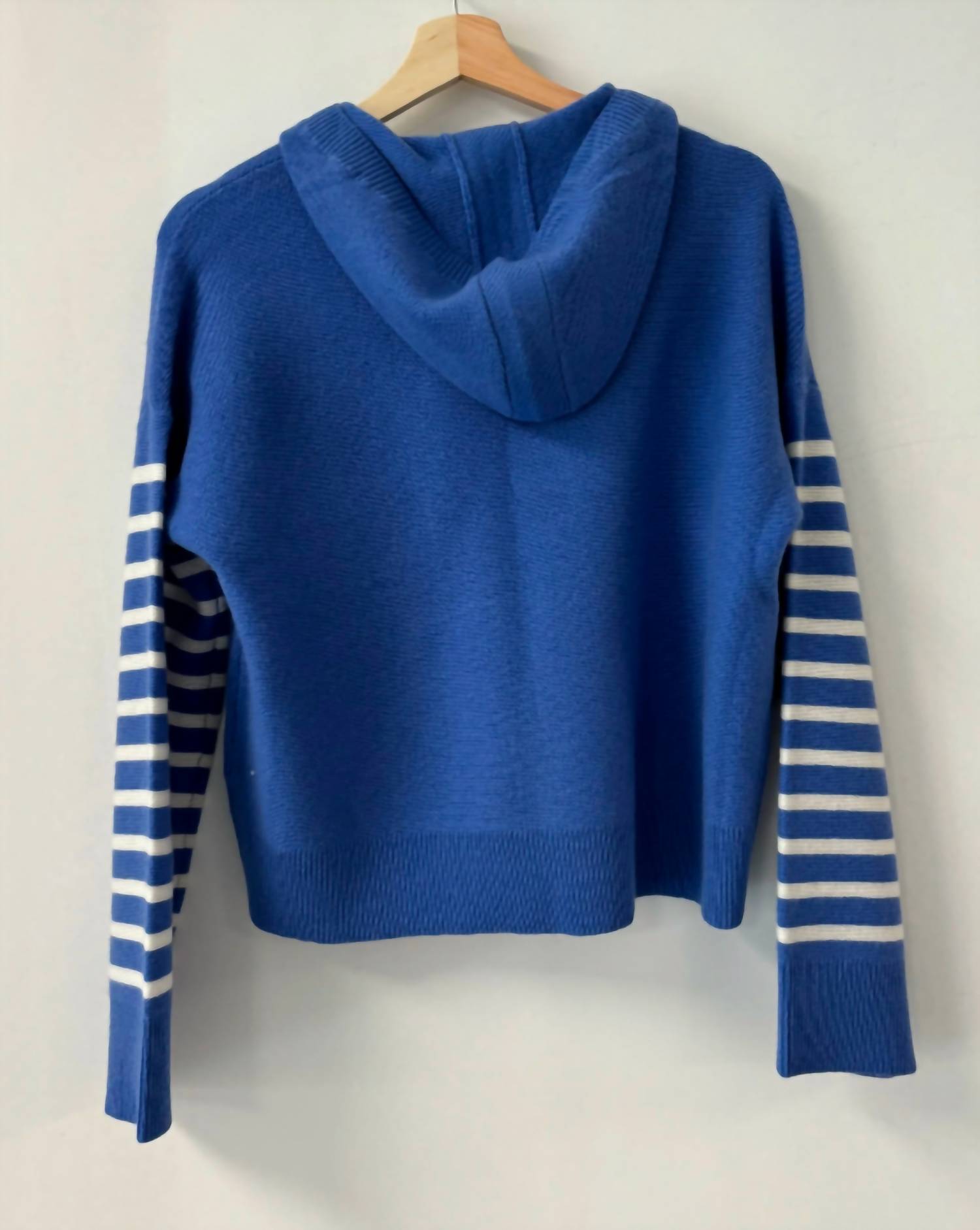 Super soft cashmere hooded sweater in a beautiful cobalt blue with white stripes on the sleeves.