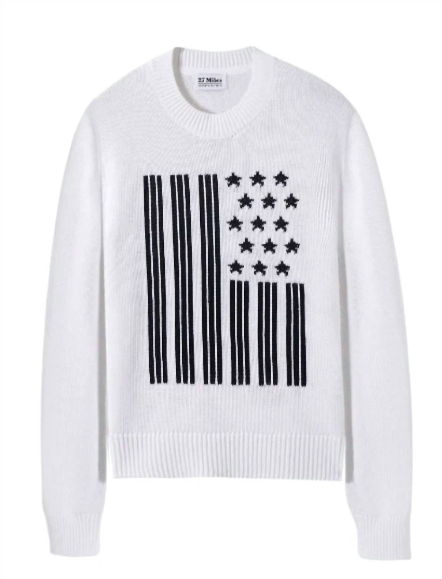 The ultimate go-to sweater, expertly crafted to provide the perfect combination of warmth and style. Its classic design and soft fabric make it a must-have addition to your wardrobe. Celebrate patriotic style with the long sleeve Freedom Sweater by 27 Miles Malibu. Crafted from cotton, this crewneck knit features a striking multi-pattern blend of vertical stars-and-stripes in crisp white, black accents. Its pull-on closure makes it effortlessly wearable for summer occasions like 4th of July celebrations or vacation outings. With its bold design, it's the perfect blend of statement-making and everyday versatility for women 30+.