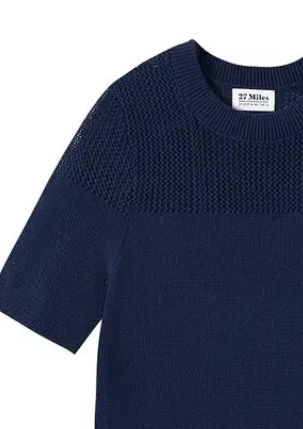 Look no further, you just found your perfect tee! Introducing the Women's Vince Knit Tee by 27 Miles Malibu, a stylish choice for those seeking comfort and elegance. This Navy tee features a short sleeve design and textured pattern with a crewneck for a classic fit. Made from 100% Cotton, it offers a straight silhouette and pull-on closure. Care: Hand wash to maintain its fine quality.