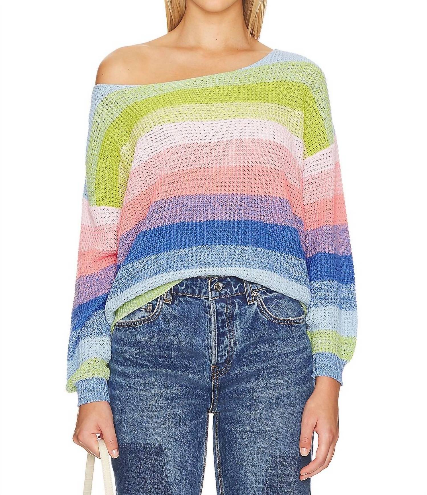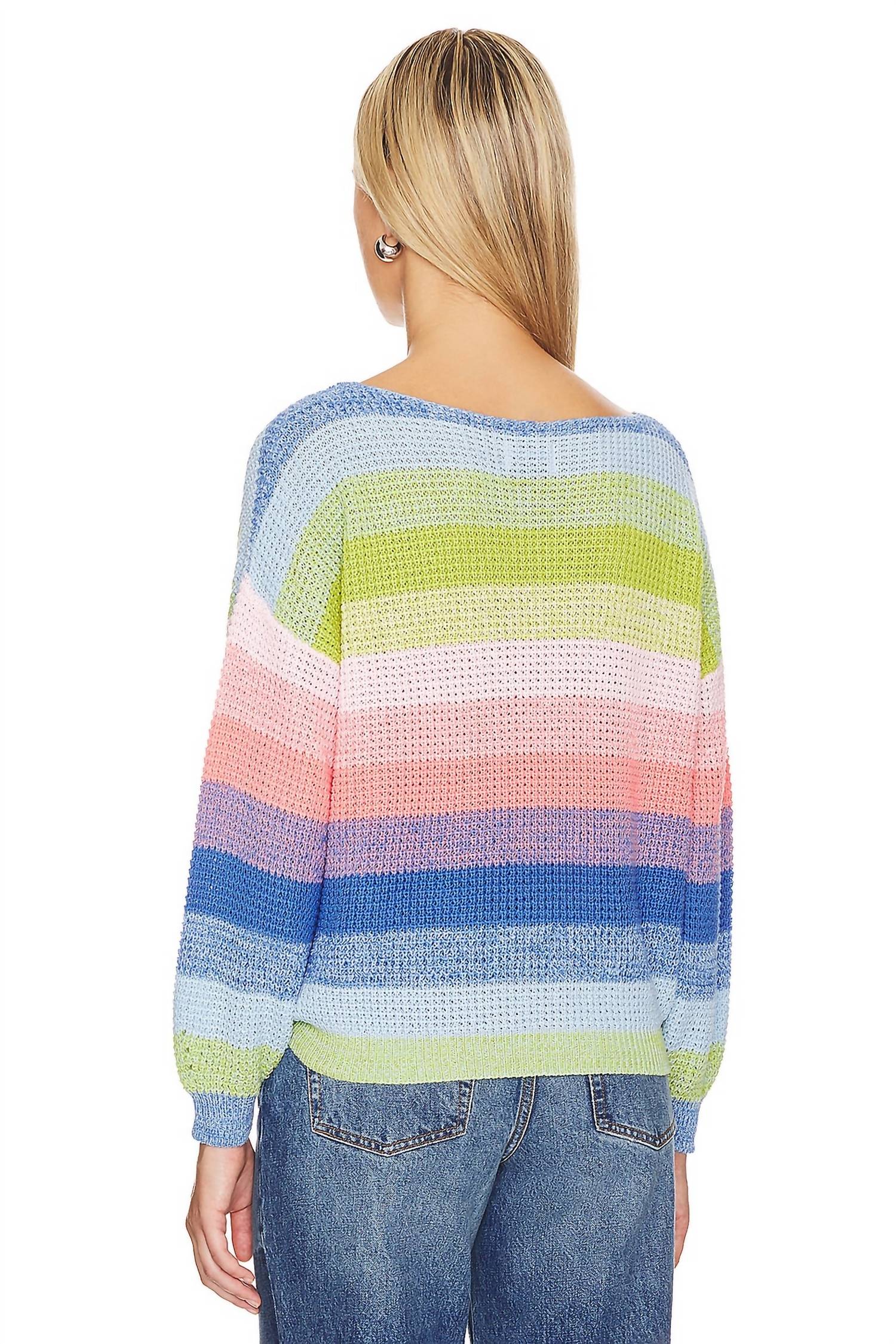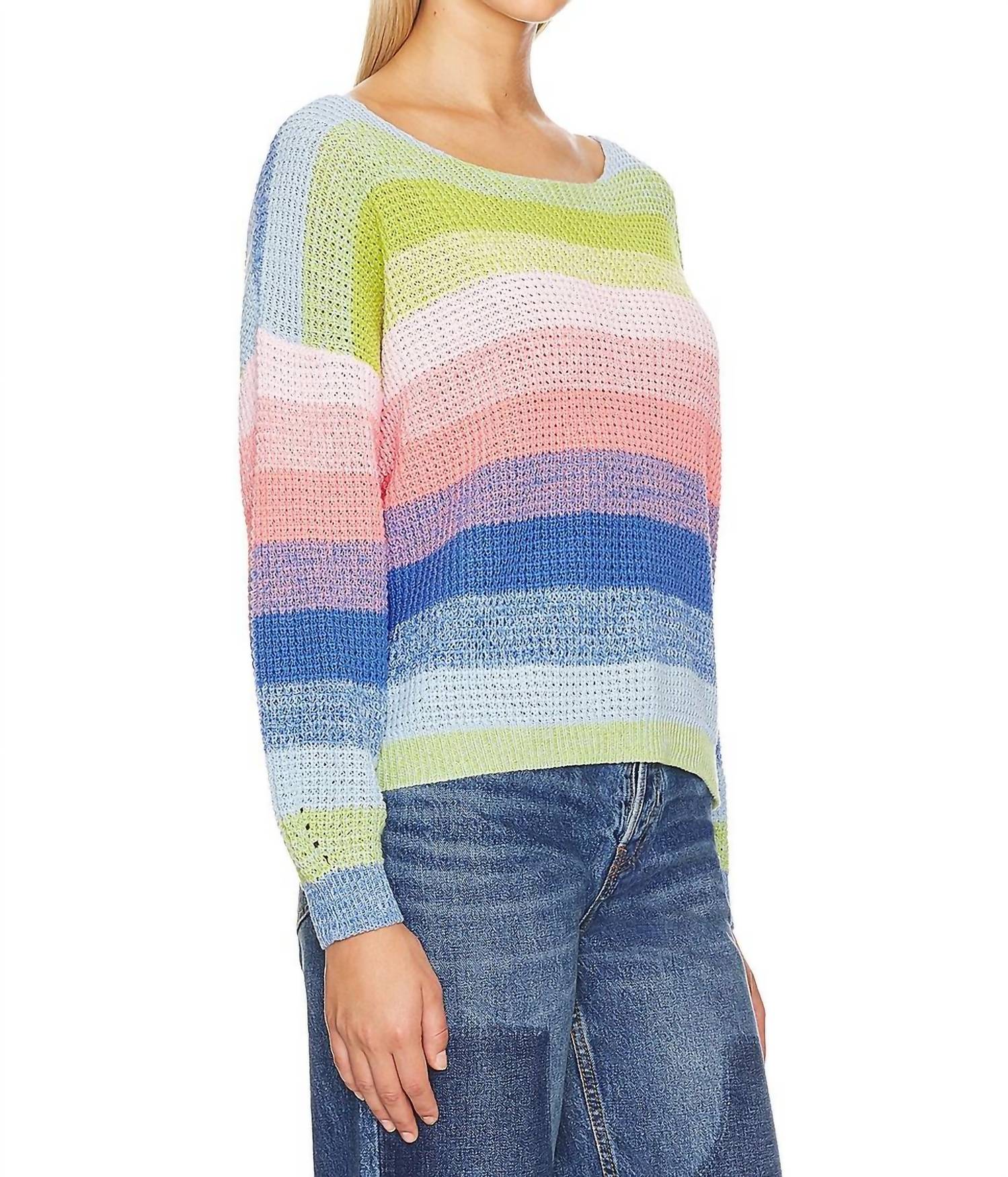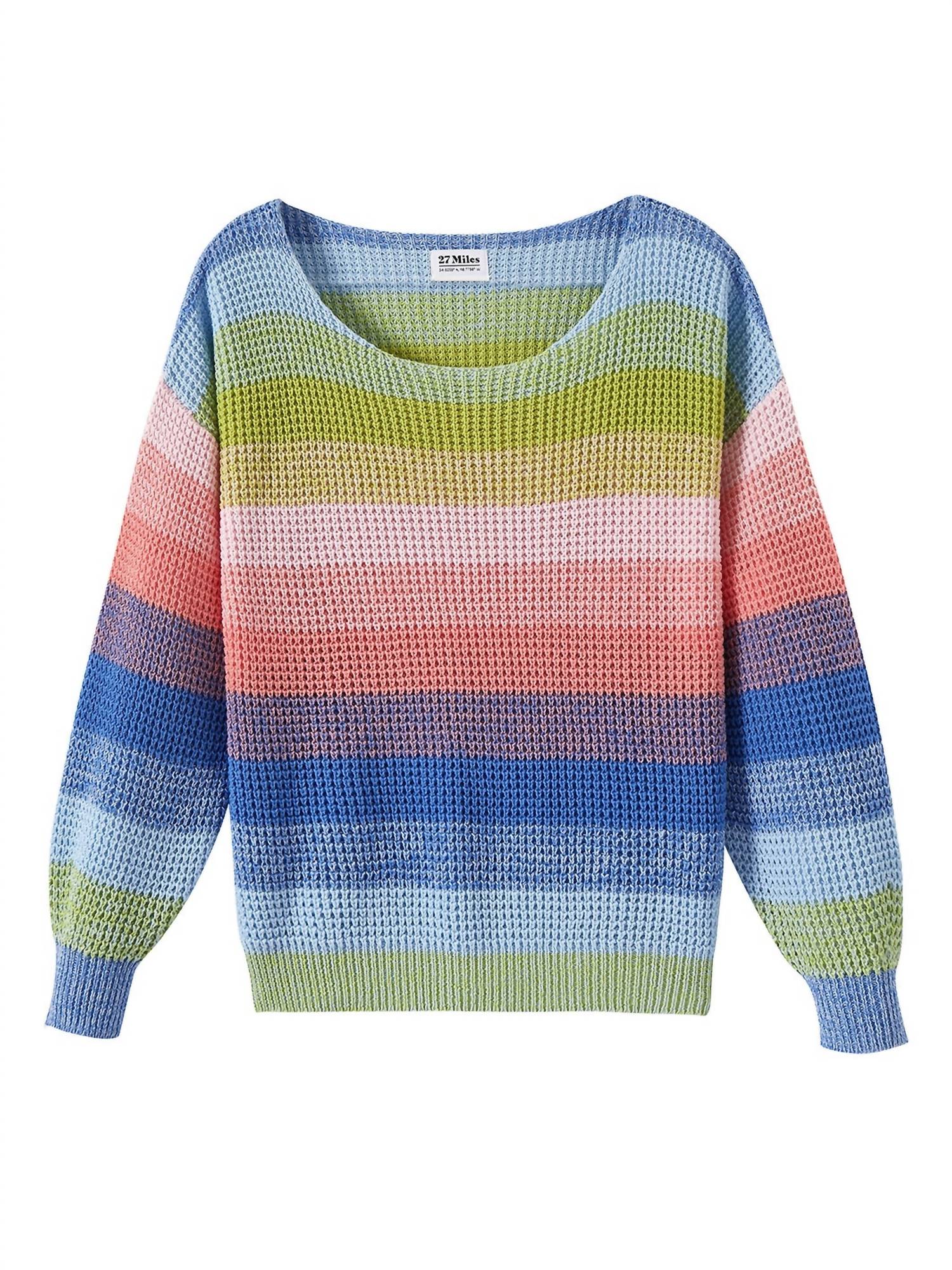 Add a burst of color to your wardrobe with the Jersey Cinzia Knit Sweater by 27 Miles Malibu, an eye-catching piece perfect for maximalist trends. This long sleeve sweater, designed with a boatneck, is made from 100% cotton and features a vibrant rainbow stripe pattern. Its open knit design offers a lightweight feel ideal for layering, with a convenient pull-on closure. Made in China, it’s easy to care for with a simple hand wash.