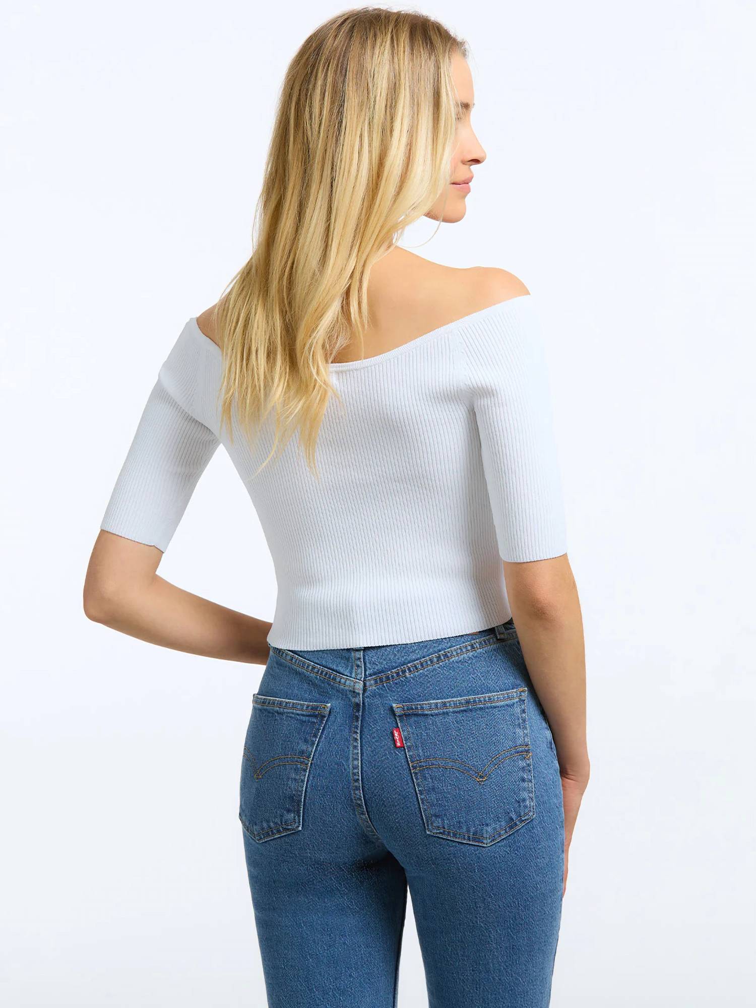 Shoulder-baring and form-fitting. Fitted. Length: 13". Machine wash cold water. 65% Viscose, 35% Nylon.