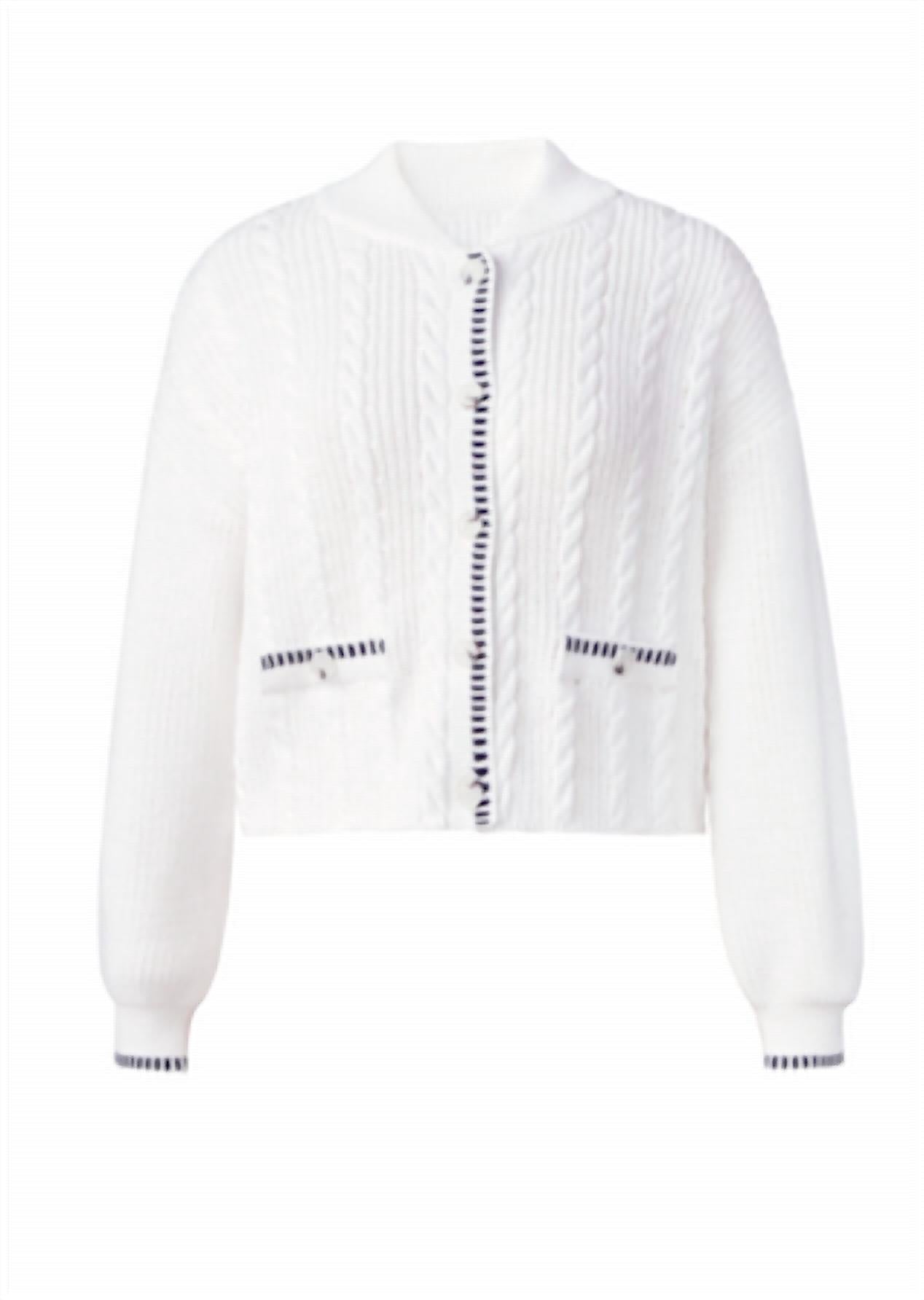 Throw this adorable cardigan over any cami or tank top. Introducing the Tana Cable Whip Stitch Bomber Cardigan by 525 America, a minimalist piece in bleach white that exudes luxurious elegance. This cardigan features long sleeves with intricate cable stitching and a whipstitch design, adding a textured flair to your wardrobe. It is perfect for spring and suitable for dinner party occasions or Thanksgiving gatherings. The cardigan is equipped with a button closure and practical pockets, making it both stylish and functional.