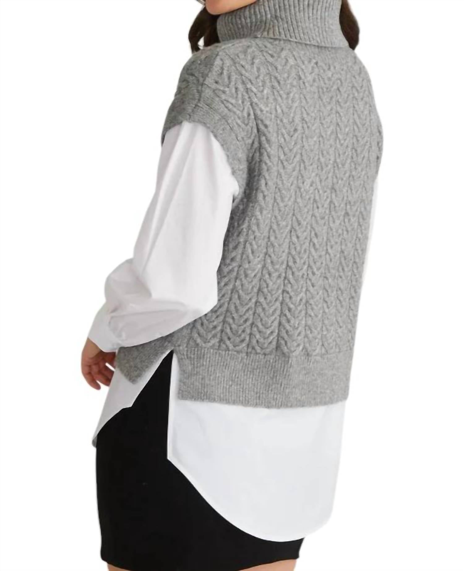Polished twist on the classic cable knit sweater. Long-sleeve piece in smoke grey. Features a fold-over turtleneck, layered white blouse underneath, and timeless cable knitting detail. With a composition of 65% Polyester, 25% Viscose, 10% Nylon. Offers durability and comfort. Pull-on closure makes it easy to wear.