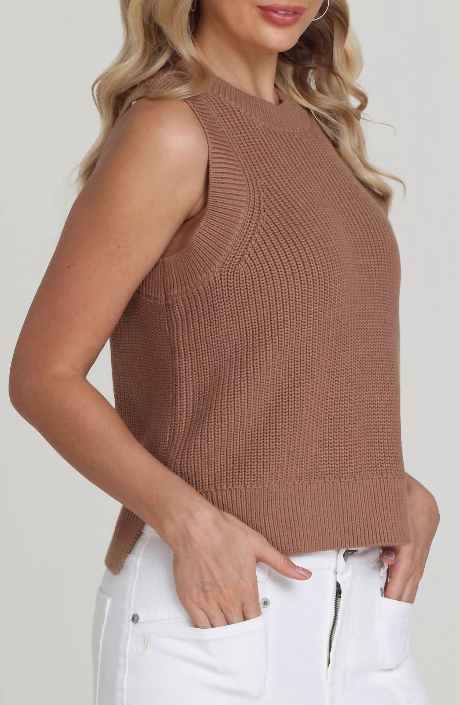 Fit, fabric and functionality. This tank top checks all the boxes. Introducing the Demi Knit Tank by 525 America, a perfect staple for chic and laid-back style. This sleeveless top in a rich cinnamon hue features a textured pattern that adds dimension to its design. Made from soft cotton, it showcases a sophisticated crewneck and is easy to wear with a pull-on closure. Ideal for summer, this versatile piece effortlessly complements skirts or denim for any occasion.