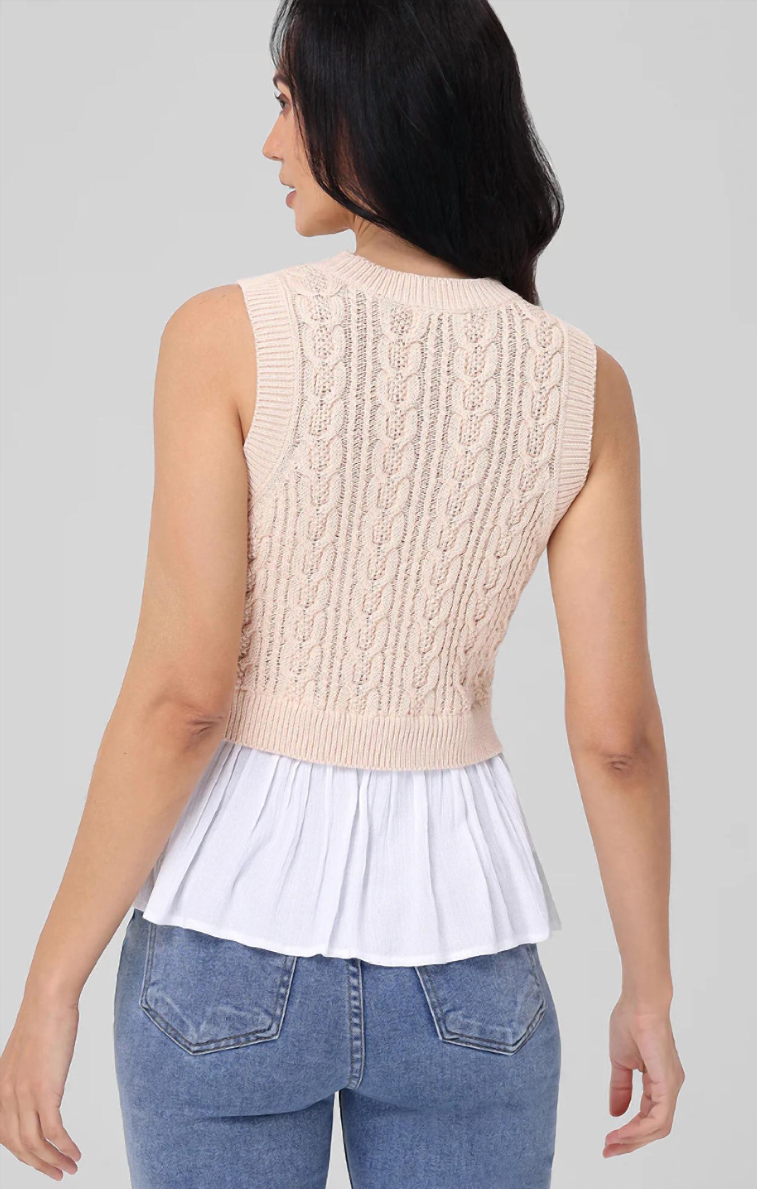 The perfect tank top for those warmer weather seasons. Embrace versatile style with the Mixed Media Cable Knit Tank Top by 525 America, a must-have for your year-round wardrobe in the Sand Dollar hue. This sleeveless tank is crafted from 100% cotton, featuring a textured cable knit detail and layered look, perfect for any preppy ensemble. Designed for a fitted silhouette, it offers a classic crewneck and convenient pull-on closure. Care: Hand wash and lay flat to dry, making it an effortless choice for any occasion.