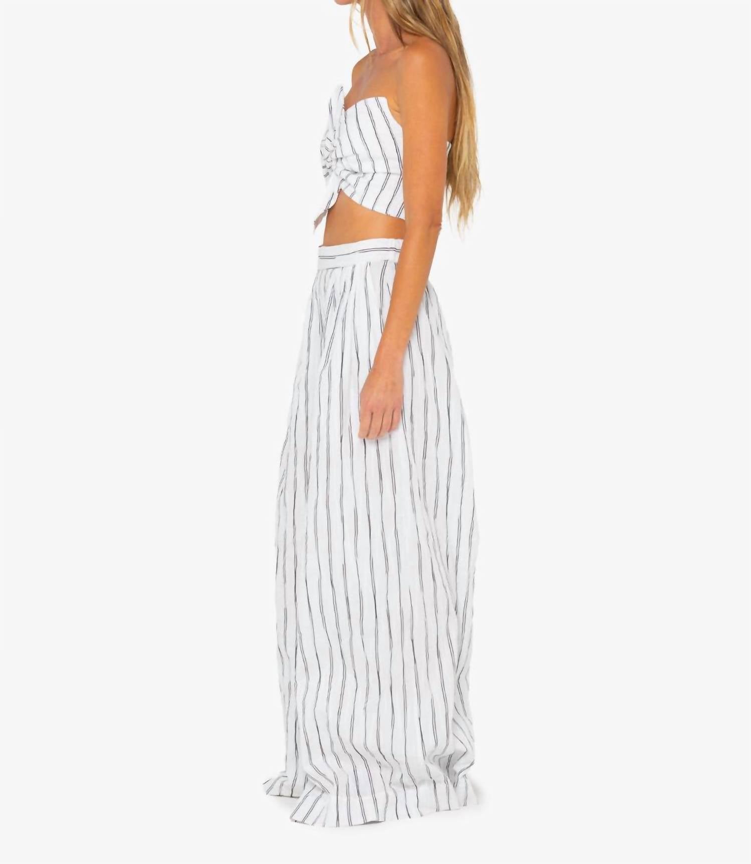 These trousers feature a high rise with an elastic waistband, side slip pockets, and a wide-leg silhouette that extends to full length. They are made from a blend of 67% cotton, 32% polyester, and 1% spandex. Made in the USA.