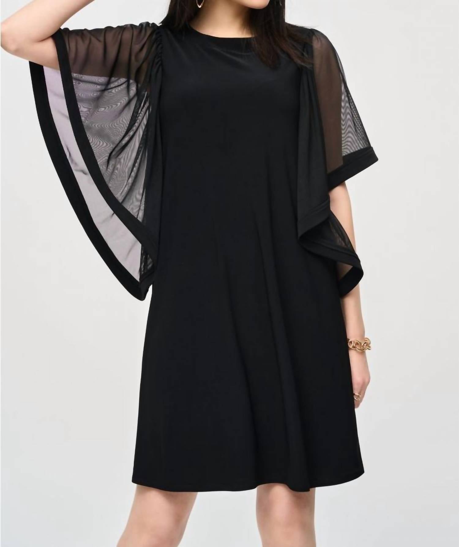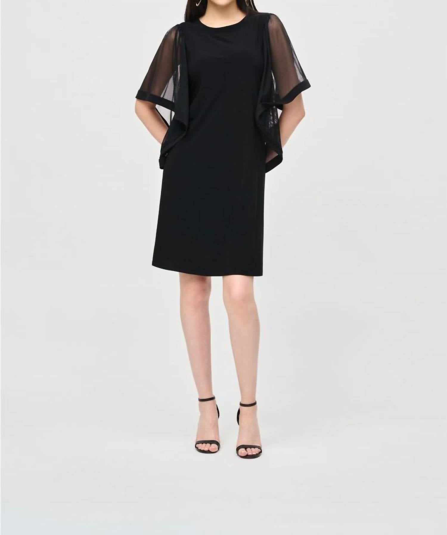 The kind of easy and flattering dress you'll be reaching for all season long. Presenting the Joseph Ribkoff Mesh Butterfly Bell Sleeve Dress in black, a chic addition to any wardrobe. With captivating mesh short butterfly sleeves and a graceful boat neckline, this mini shift dress is crafted from a luxurious blend of 96% polyester and 4% spandex. Originating from Canada, it features a convenient back zip closure and is designed to fall elegantly above the knees. Care for this stylish piece by hand washing in cold water with like colors and laying flat to dry in the shade.
