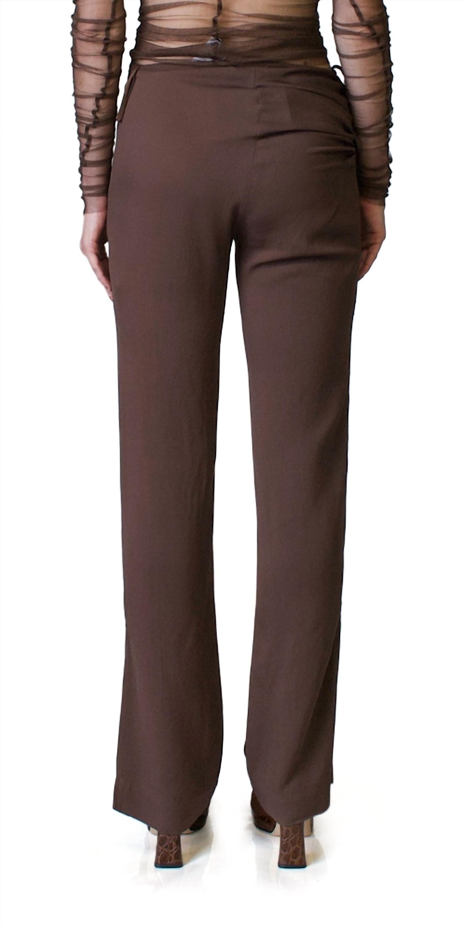 This Bertoria Hiker Pants blend style and comfort in a rich chocolate hue. Crafted from a 97% viscose, 3% spandex, they offer a fluid drape with a standout ruched tie side detail at the hip and a side slit at the hem for freedom of movement. Designed with a high-rise fit and a back zip closure. The flared leg design adds chic appeal.
