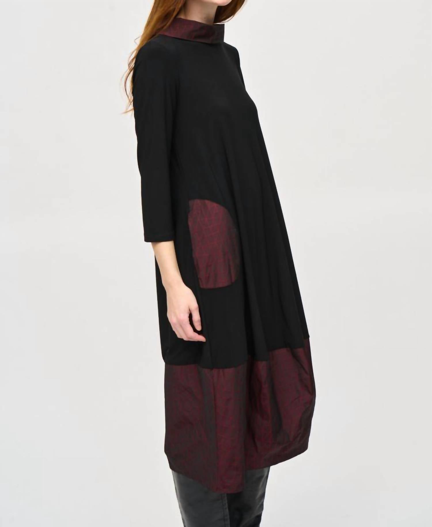 Introducing the Joseph Ribkoff Cowl Neck 3/4 Sleeve Midi Dress, a striking piece in rich black and red. This dress features three-quarter sleeves and a sophisticated cowl neckline, crafted from a luxurious blend of 96% polyester and 4% spandex. With its geometric-printed memory fabric inserts and practical side pockets, this midi dress offers both style and functionality. Made in Canada, it closes with a back zipper and is easy to care for: simply hand wash in cold water, lay flat to dry, and wash inside out.