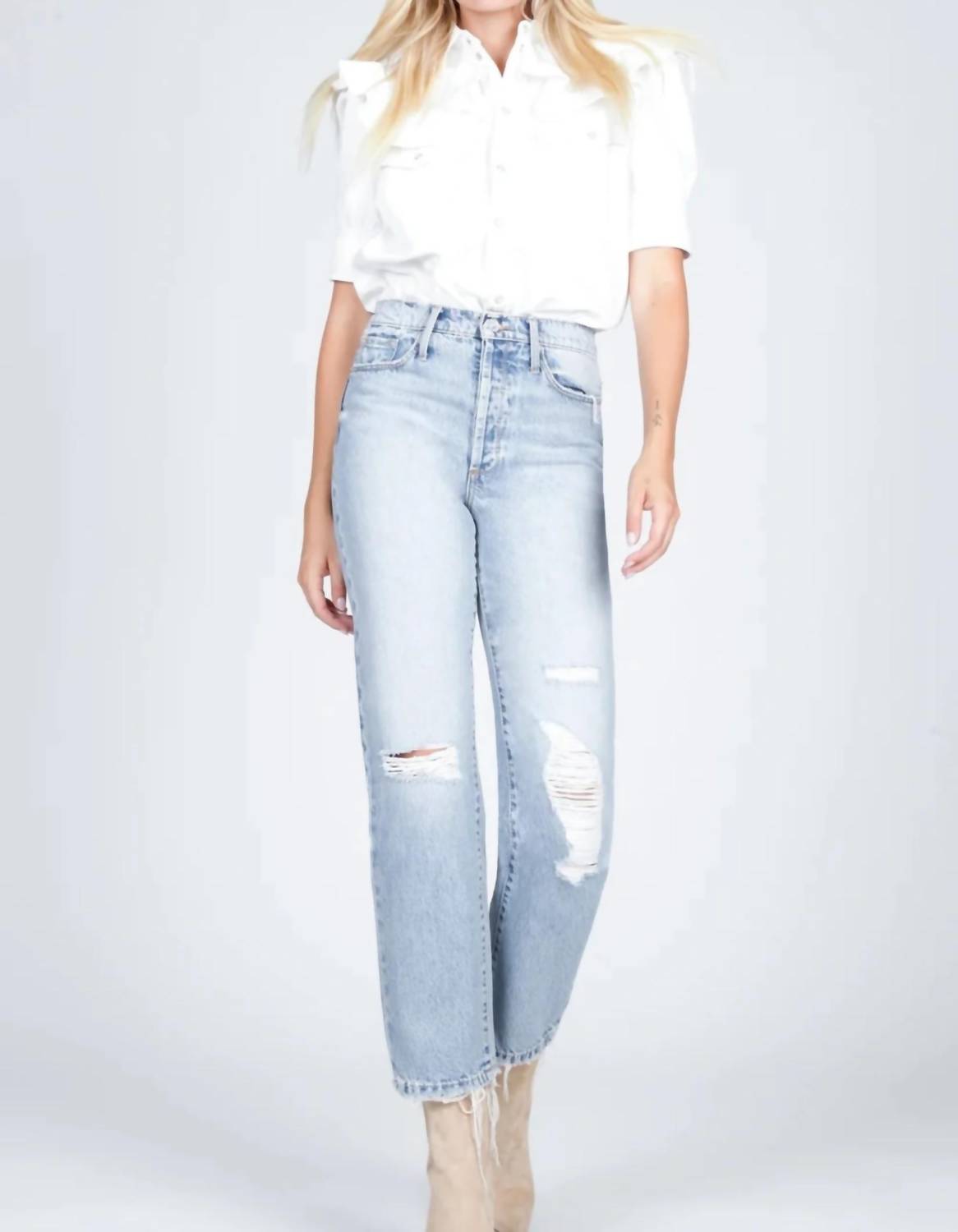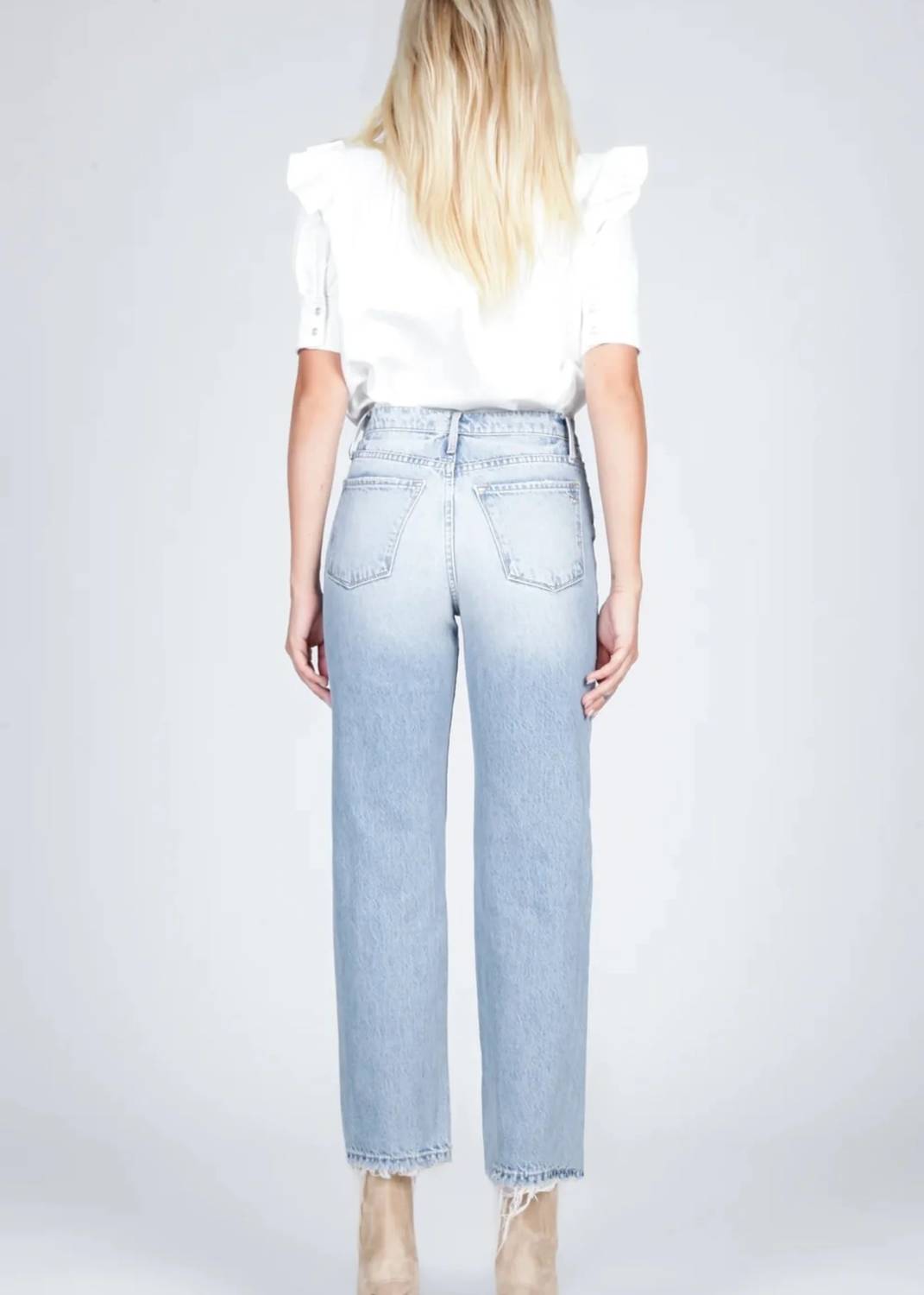 Light blue wash jean featuring a straight leg cut, distressing around the knees, and ankle fray detail. Rise 12.5", Leg Opening 15.5", Inseam 29". Machine wash cold. 100% Cotton.