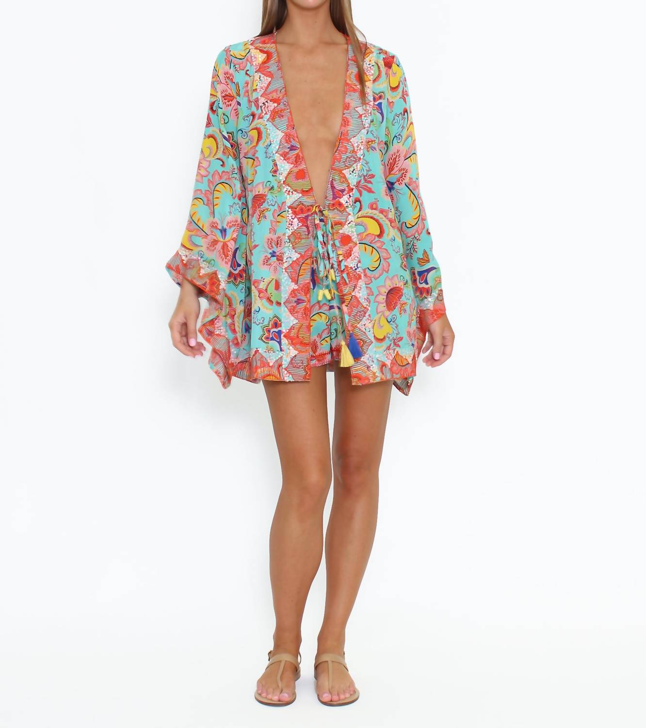 Introducing the SCILLA TOP by TAJ by SABRINA CRIPPA, a vibrant addition to any wardrobe. This women's long sleeve tee showcases the eye-catching 'Turquoise Happy Flower' print, perfect for adding a splash of color. Its flattering V-neck design complements the floral pattern beautifully. Ideal for making a statement, this top is crafted with attention to detail, ensuring a chic and comfortable fit.