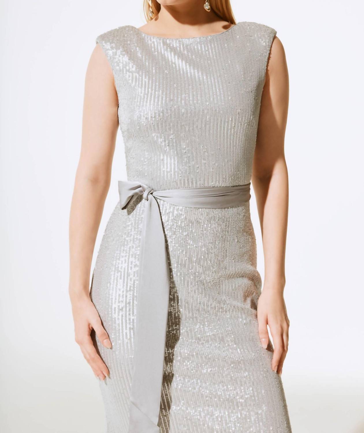 Looking for that perfect event dress? Look no further... Introducing the Joseph Ribkoff Sequined Formal Evening Long Dress in an exquisite Matte Silver, perfect for making a statement at any special occasion. This elegant piece features cap sleeves, a boat neckline, shoulder pads, and a luxurious woven mesh fabric adorned with sequins, complete with a satin waist sash. Made from 95% Polyester and 5% Spandex, this A-line dress is crafted with a back zip closure for added sophistication. Proudly made in China, it requires professional dry cleaning; do not wash or tumble dry.