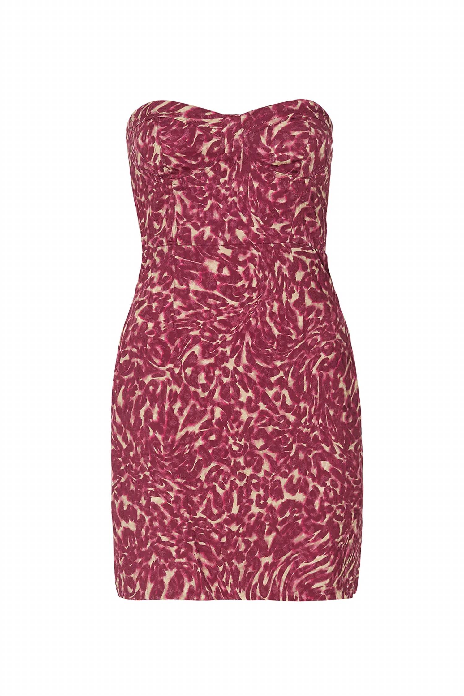 The kind of easy and flattering dress you'll be reaching for all season long. The Kinsley Mini Dress is made from 52% viscose and 48% rayon fuchsia leopard jacquard fabric. It is strapless with a fitted, sweetheart neckline and bustier bodice. The dress features a hidden back-zip closure and is designed for all holiday occasions. It is made in the USA and should be dry cleaned. The model, who is 5'9" with a 25-inch waist, 33-inch bust, and 36.5-inch hips, wears size XS.