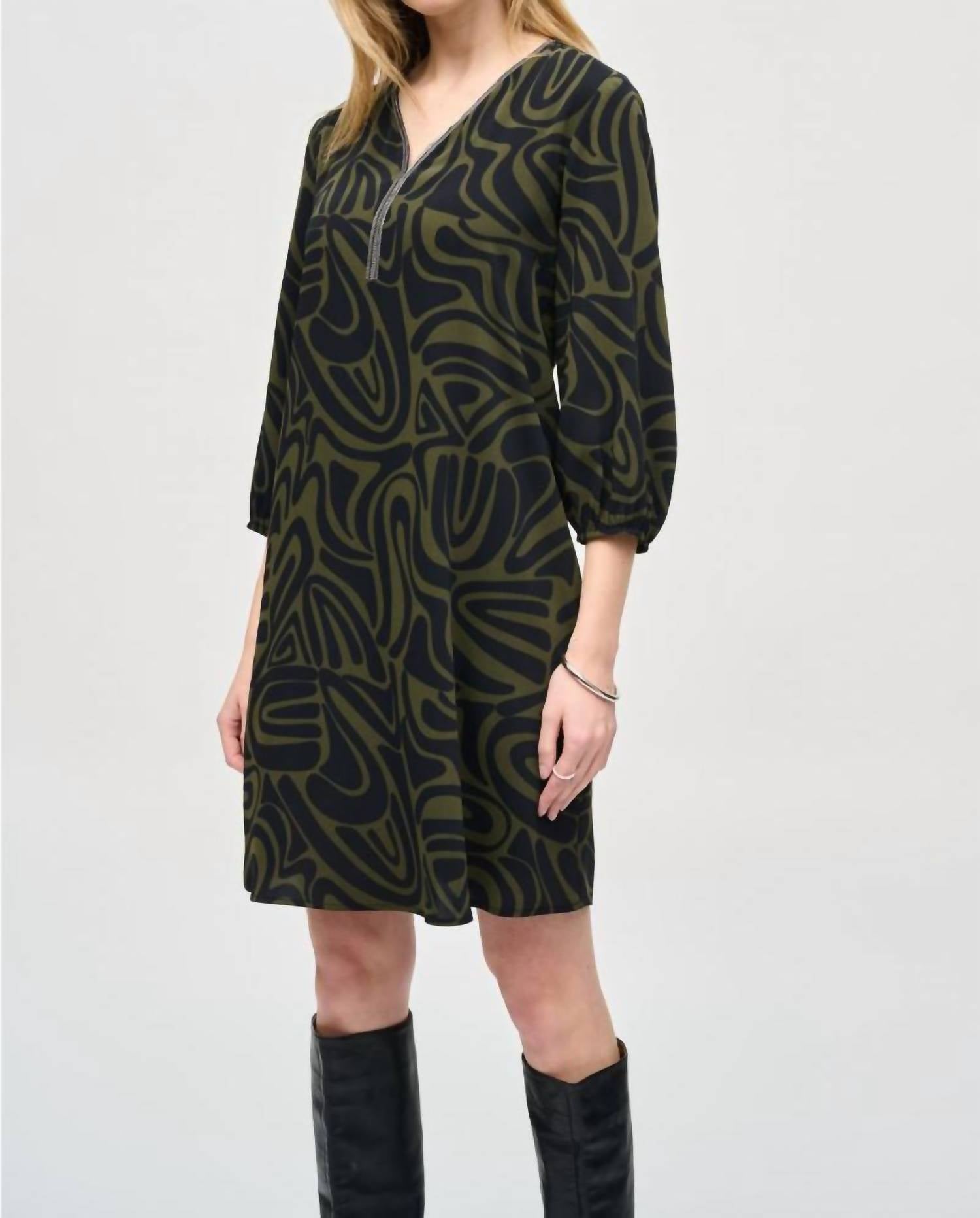 Discover the Abstract Print Puff Sleeve Shift Dress by Joseph Ribkoff, an eye-catching piece in black and green. Designed with three-quarter puff sleeves and a playful graphic pattern, this mini dress is composed of 100% polyester for a comfortable wear. Featuring a chic V-neckline, embellished trim, and a hem that falls above the knee, this Canadian-made dress is easy to slip on with a pull-on closure. Care for this stylish number by hand washing in cold water, hanging to dry in the shade, and washing inside out.
