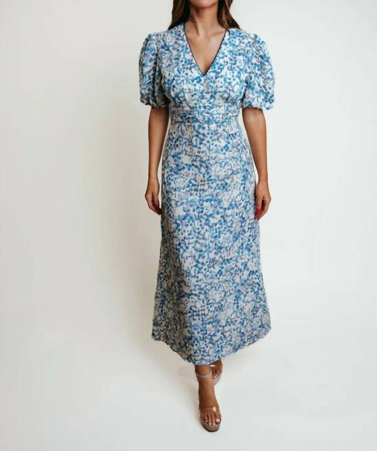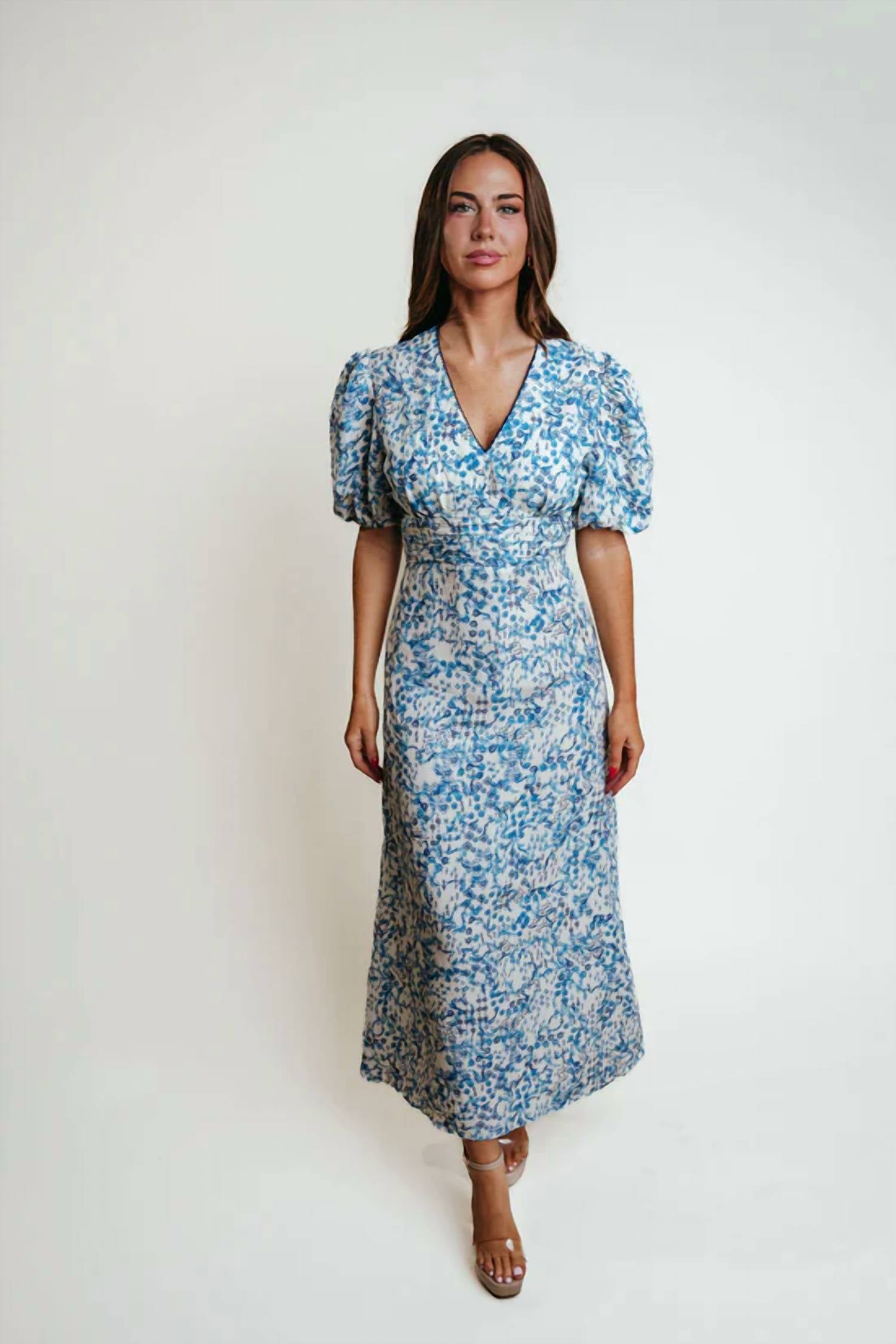 Just add slides or mules and you are good to go. shown in Mykonos cotton poplin fitted waist with zipper v-neck elastic puff sleeve midi length lace trim