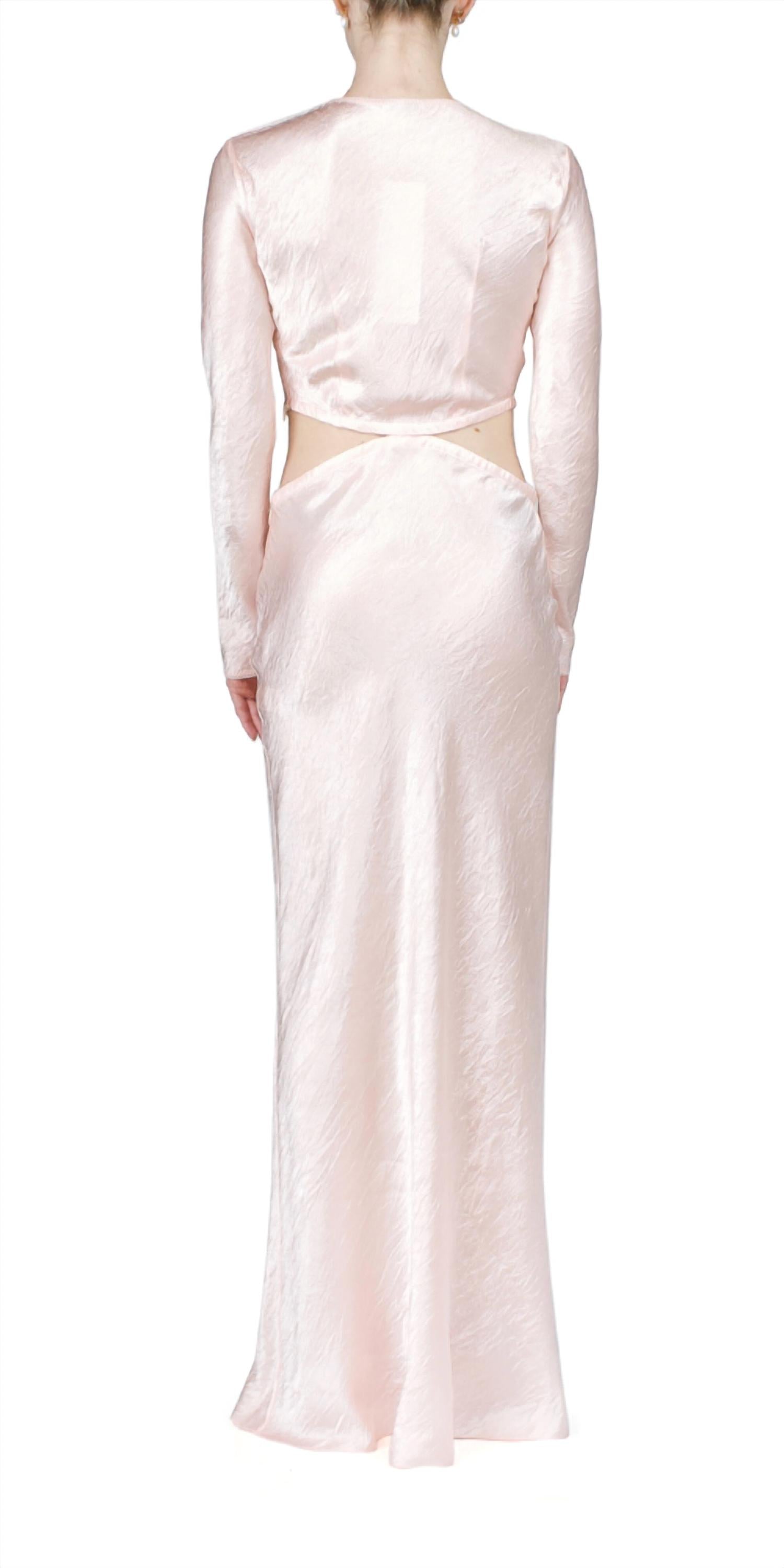 This Satin Maxi Dress combines elegance and sustainability with 100% sustainable acetate. Features include a crewneck, long sleeves, and a daring cutout at the waistline. The mermaid hem offers graceful movement. With zip closure at the back.
