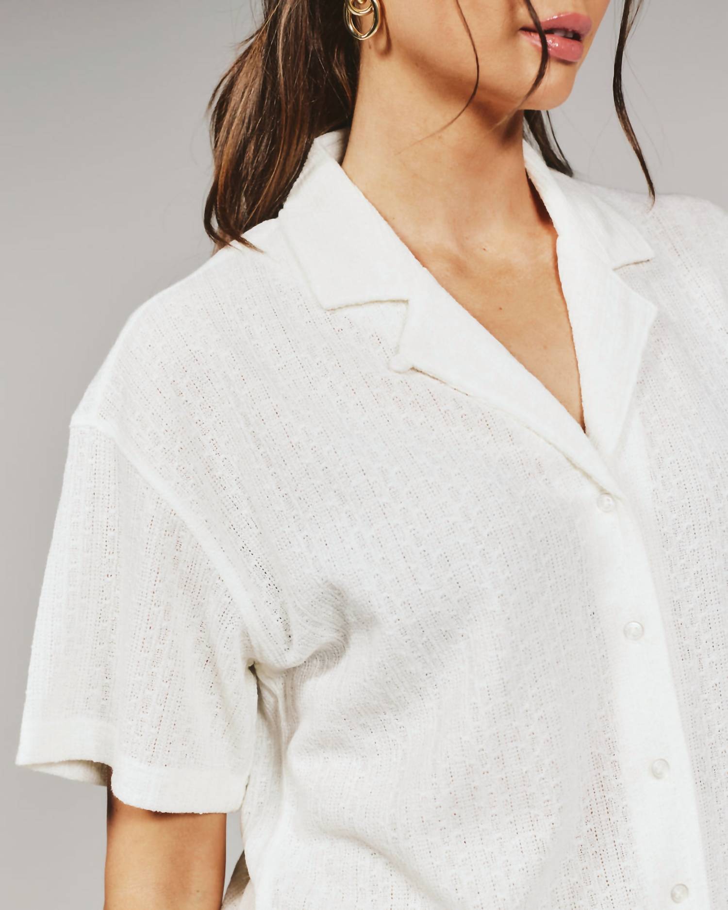 A classic button down shirt that will never go out of style. Elevate your holiday wardrobe with the Isla Camp Shirt by 7Diamonds, perfect for a sunny getaway in timeless ivory. This short-sleeve shirt is crafted from a 100% polyester textured knit fabric, offering a buttery-soft feel that promises a relaxed fit. Designed with logo button closure and a classic collar neckline, it's an effortless piece for a minimalist spring look. Care is easy: machine wash cold with similar colors, tumble dry low, and iron on low if needed.