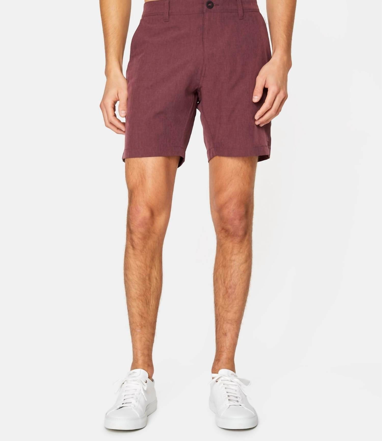These 4-way stretch hybrid shorts are made from 46% recycled polyester, 46% polyester, and 8% spandex. They feature signature 7DIAMONDS contrast taping and quick-dry fabric, suitable for both water and land activities. The inseam measures 7 inches. The model is 6'1" and wears size 32. Care instructions include machine wash cold, do not bleach, tumble dry low, do not iron, and do not dry clean.