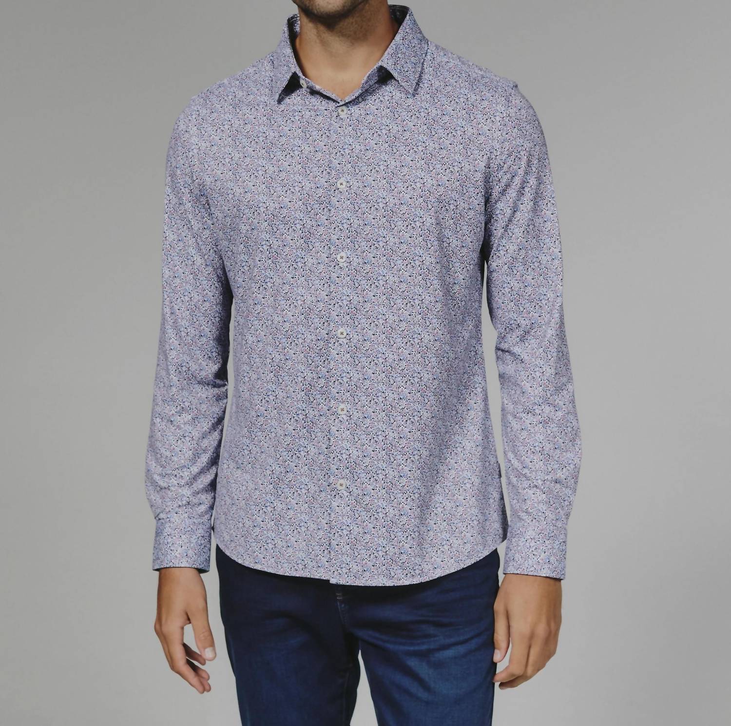 Introducing the 7Diamonds Prague Long Sleeve Shirt, a perfect blend of style and comfort in a striking Stone Rose hue. This button-up shirt combines a classic collar and a stunning floral pattern, crafted from 93% Polyester and 7% Spandex for ultimate performance. Its long sleeves and wrinkle-resistant fabric make it a versatile addition to any wardrobe, suitable for day-to-night occasions. Care: Machine wash cold on delicate cycle, avoid bleach, oil, or alcohol, iron on low if needed, and line dry for best results. Model is 6'1" and wears a size medium.