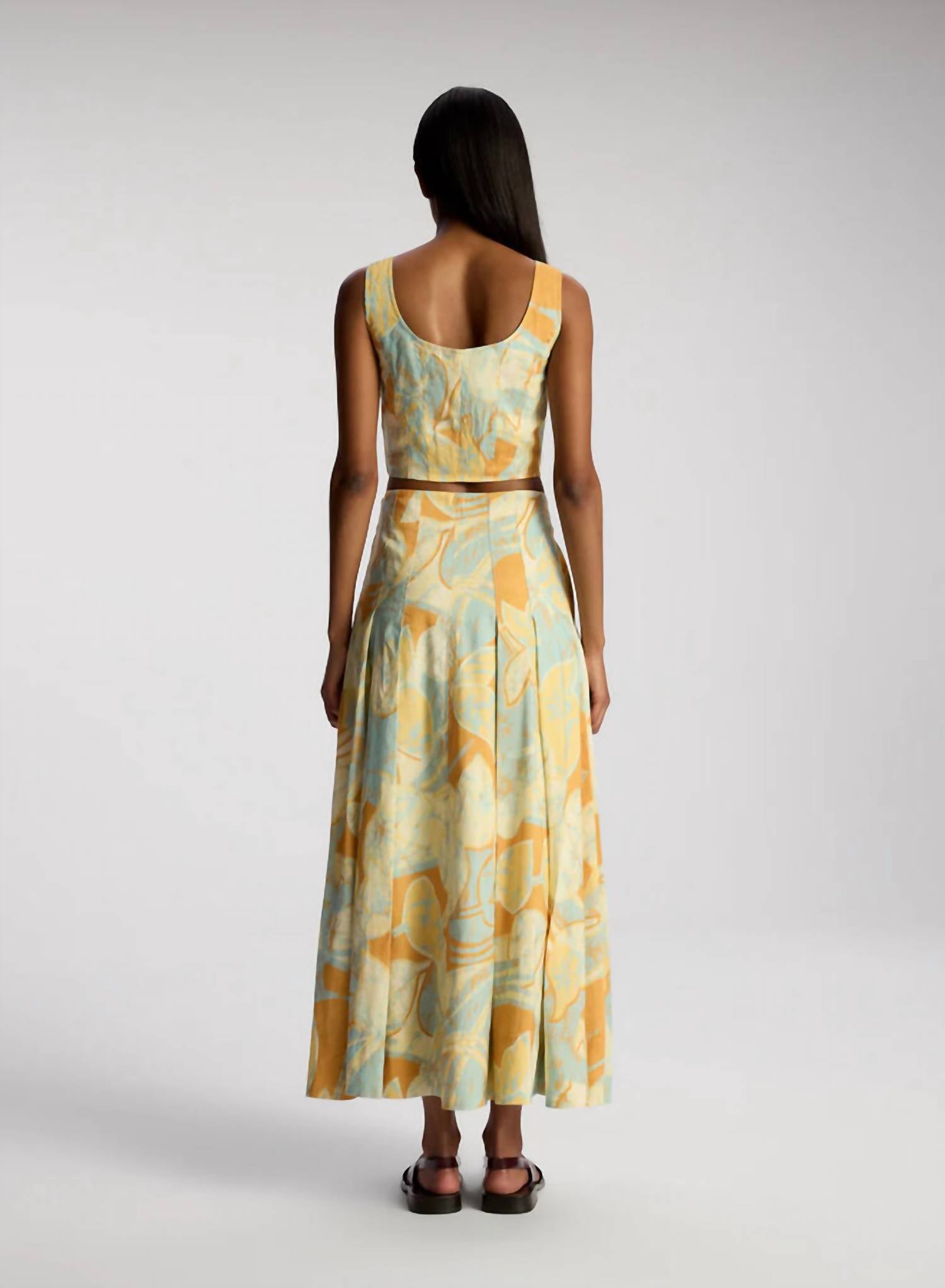 Pair this crop top with your favorite high-waisted jeans or maxi skirt. Introducing the Isabel Top by A.L.C., a luxurious crop top in a striking cumin/sea glass pattern. This piece is sleeveless with a scoop neck and features corset-inspired seaming, crafted from a linen blend of 57% linen, 40% viscose, and 3% elastane. Measuring approximately 9 inches from shoulder to hem, this top closes with a convenient side zipper. Imported and designed for the sophisticated summer wardrobe, it should be dry cleaned only. Model is 5'10" tall.