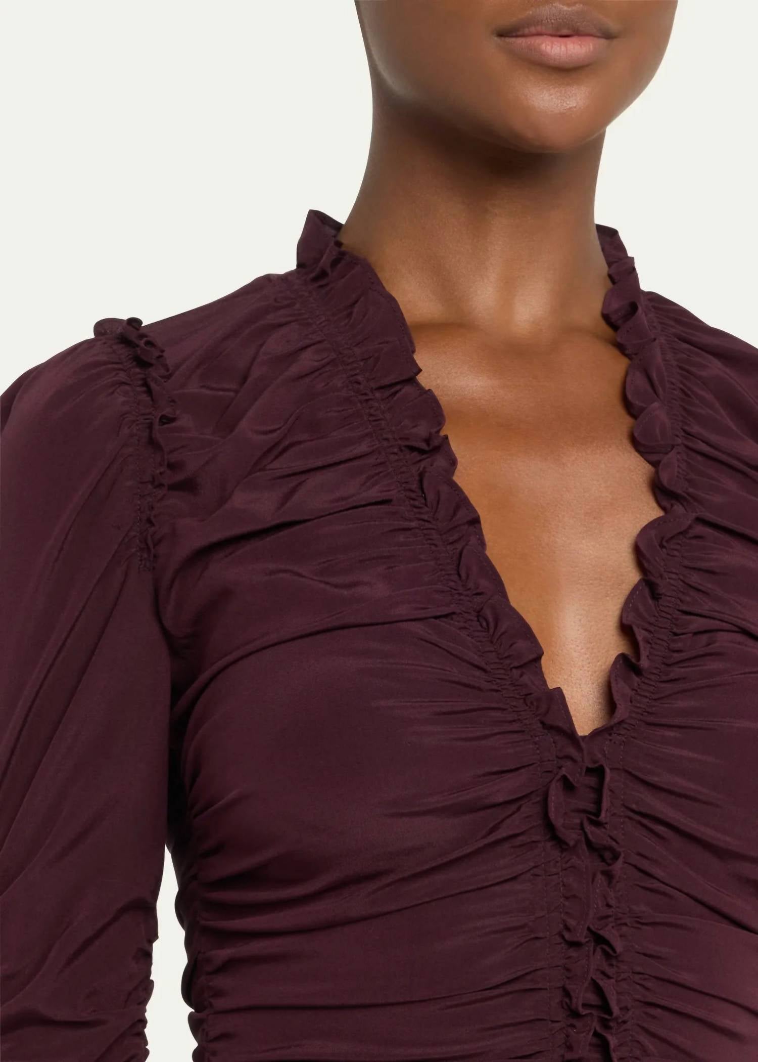 The Beckett Top is crafted of our solid stretch silk fabric in timeless white. This long-sleeve silhouette is ruched and gathered for a body-skimming fit, featuring a plunging V-neckline and ruffled detailing.