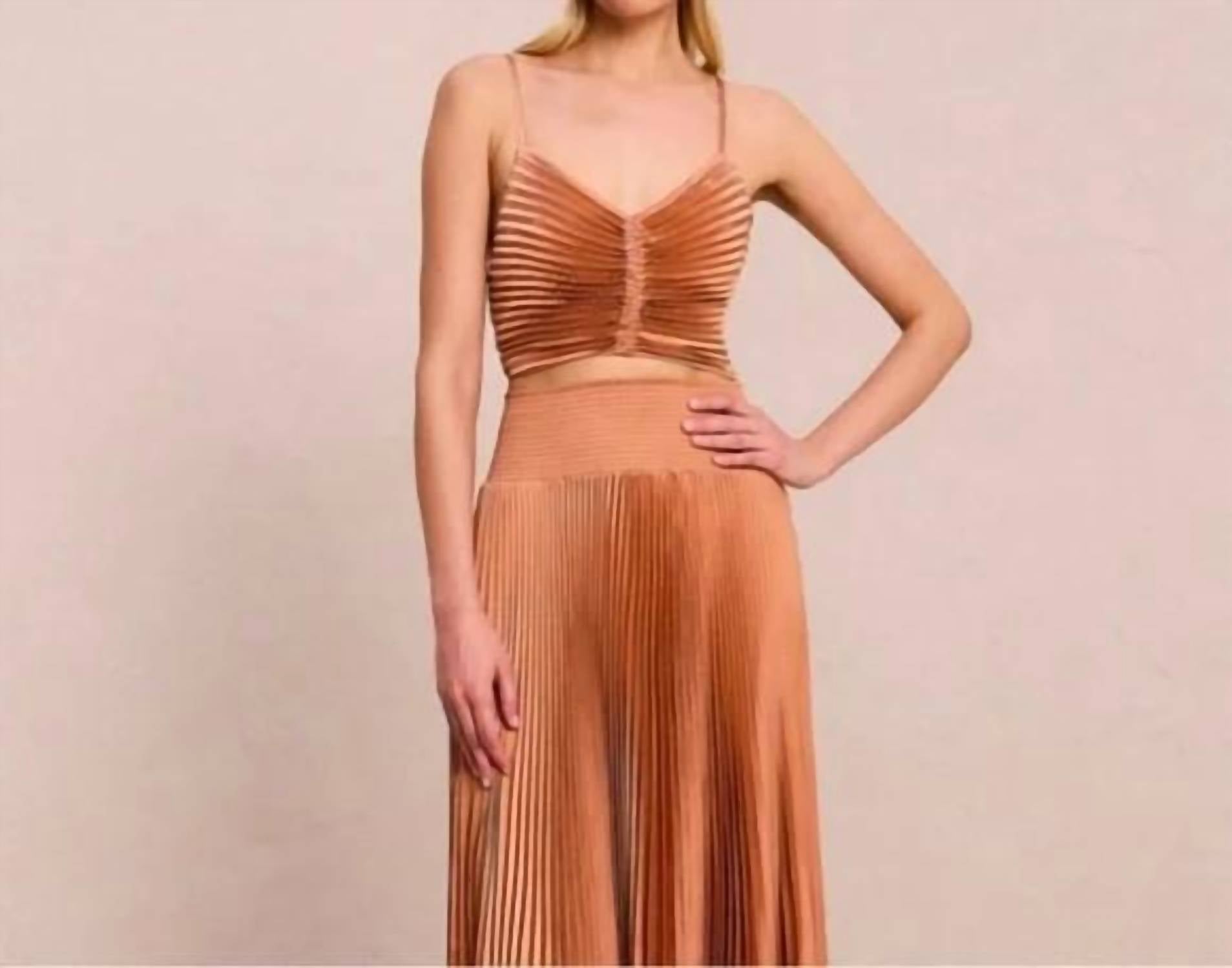 Show a little skin in this cute and casual crop top. Experience the chic elegance of the A.L.C. Ari Il Crop Top, a modern piece with accordion pleated satin design in torta. This stylish crop top features spaghetti straps and an eye-catching textured pattern, perfect for a dinner party. Made from 100% polyester, the pull-on style measures approximately 16 inches from shoulder to hem. Machine wash for easy care, imported for high quality. Size 4 fitting, approximately 15.5 inches pit to pit.