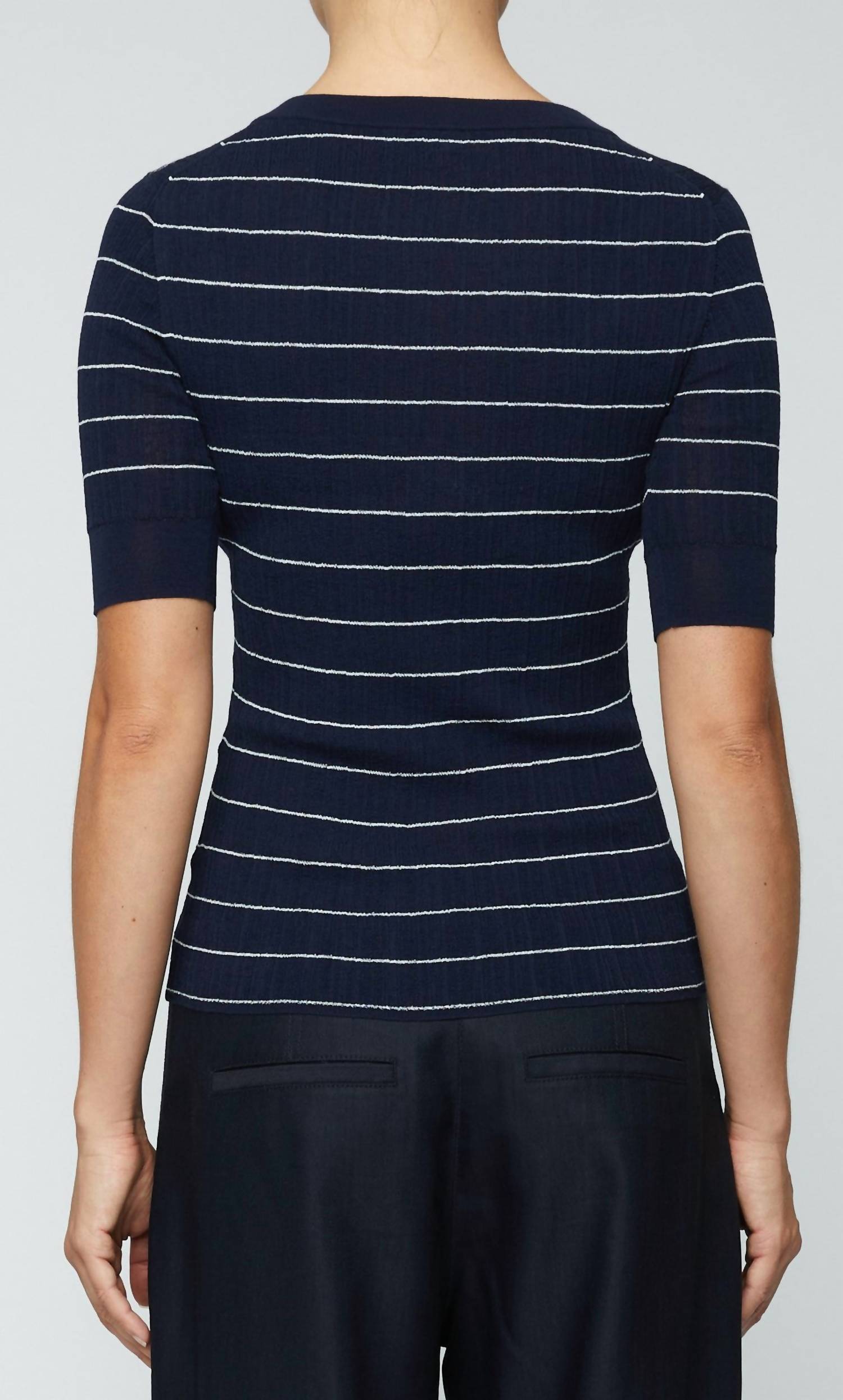 This classic, short sleeve tee will be your go-to staple this season and beyond. Elevate your wardrobe with the Francis V Neck Top by A.L.C., a perfect blend of style and comfort in navy and bright white stripes. This short sleeve piece in a cotton blend features a chic V-neck and a streamlined fit with button closure, making it ideal for any dinner party or spring occasion. Composition: 78% Cotton, 22% Nylon. Garment Length: 23.5 inches.