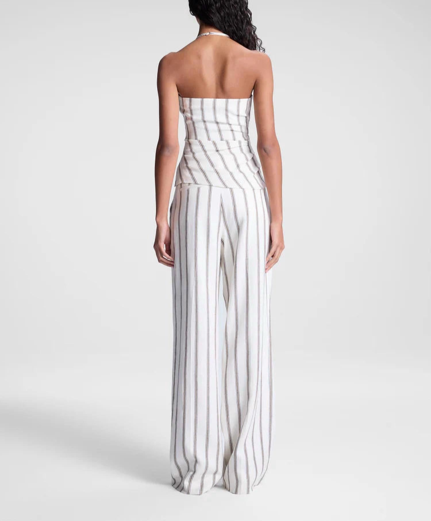 A perfectly tailored straight leg that you'll want in every color! Introducing the Cream Stripe Charles Pant by A.L.C., a chic addition to your summer streetwear collection. Crafted with 67% Linen 31% Viscose 3% Elastane woven in Portugal, these floor-length pants feature a wide, relaxed fit with a mid-rise waist. The design is adorned with fine vertical stripes in black, navy, and tan, highlighted by refined front pleats and a straight leg style. Closure is pull-on, with an inseam measuring 32 inches. Easy to care for with hand wash and line dry instructions, making it the ideal travel companion.