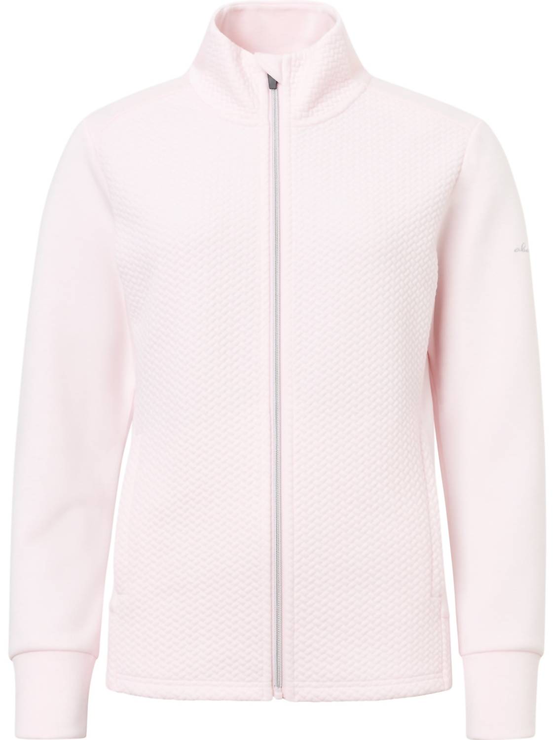 The ultimate cool-girl utility jacket. Introducing the Carden Midlayer Full-zip Jacket by Abacus Sportswear US, a chic addition to your spring wardrobe in light pink. This women's utility jacket features long sleeves and a mockneck design, crafted from stretchable fleece for enhanced comfort and warmth. It includes a jacquard knitted pattern on the main body and collar, with flat knitted sides and arms, complemented by two zippered side pockets for convenience. Closure: Zip closure. Care: Machine wash and tumble dry.