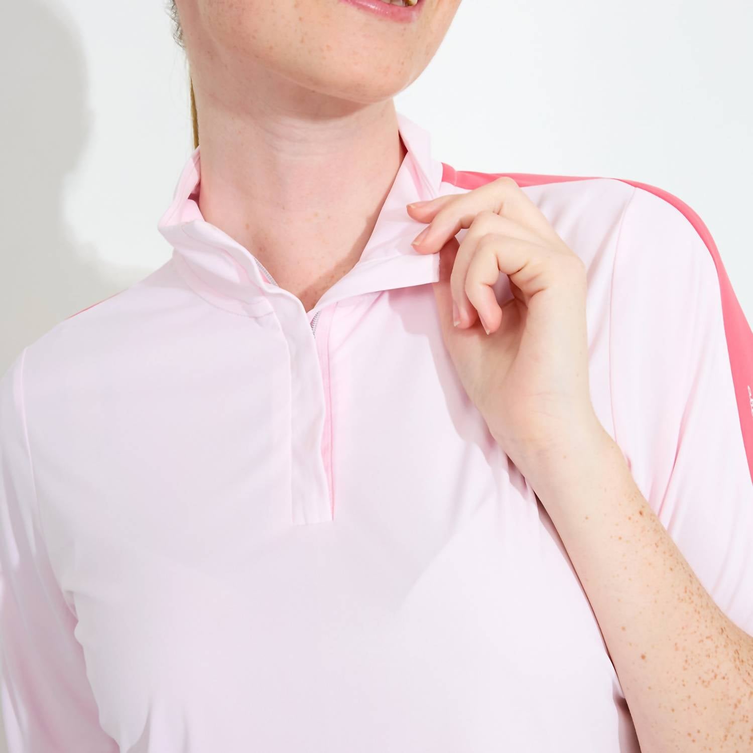 The short sleeve tee you'll want in every color. Introducing the Aloha Half-Zip Short Sleeve Shirt by Abacus Sportswear US, designed for women seeking both style and sun protection. This sporty top in light pink features short sleeves, a mockneck, and a zip closure, perfect for a day on the golf course. Made from nylon with a UPF 50 rating, it offers enduring UV protection without chemicals, while DryCool technology ensures you stay cool and comfortable. Care: Machine wash and line dry.