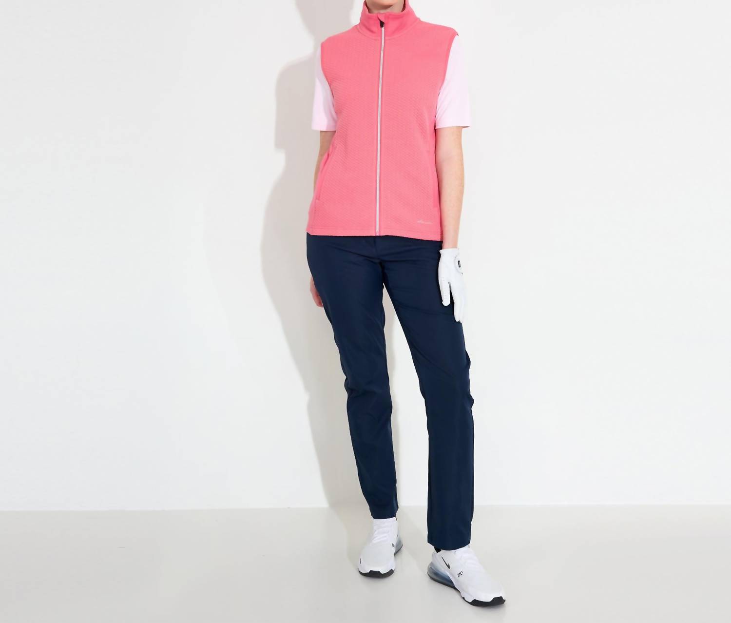 This utility jacket is the perfect combination of cool and feminine. Elevate your spring game day attire with the Carden Midlayer Full-zip Vest by Abacus Sportswear US, featuring a flattering feminine cut in a vibrant Lipstick hue. This sleeveless vest, made from soft and stretchable fleece, showcases a jacquard knitted pattern and offers superb warmth with its longer body design. With its zip closure and two side zippered pockets, it combines style with utility. Care is effortless with machine wash and tumble dry instructions, making it ideal for an active, athleisure-inspired wardrobe.