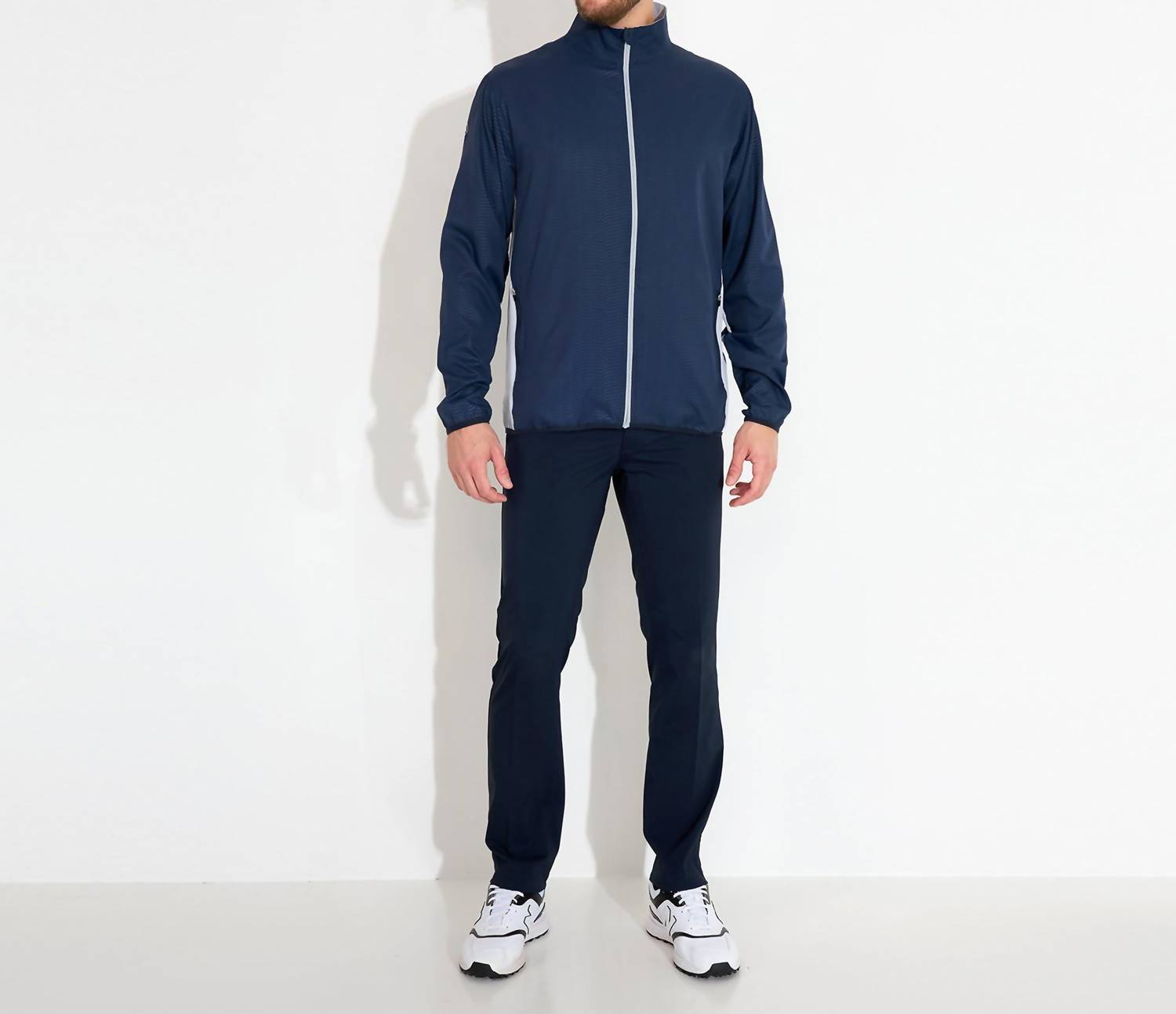 Meet the Lanark Stretch Wind Jacket by Abacus Sportswear US, a game-changing addition to your wardrobe in Navy Light Grey. This long sleeve jacket, crafted from recycled material, features a distinct multi-pattern with solid contrast on sleeves and shoulders. Designed for optimal performance, it includes a full zip closure, practical zipped chest pocket, and elastic bindings for a tailored fit. Lined and versatile, this mockneck jacket is machine washable and can be tumble dried, making it ideal for any Game Day occasion.