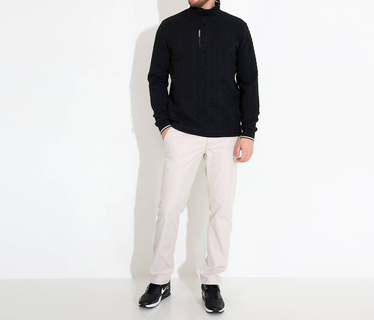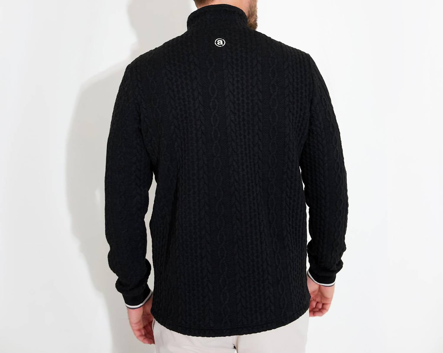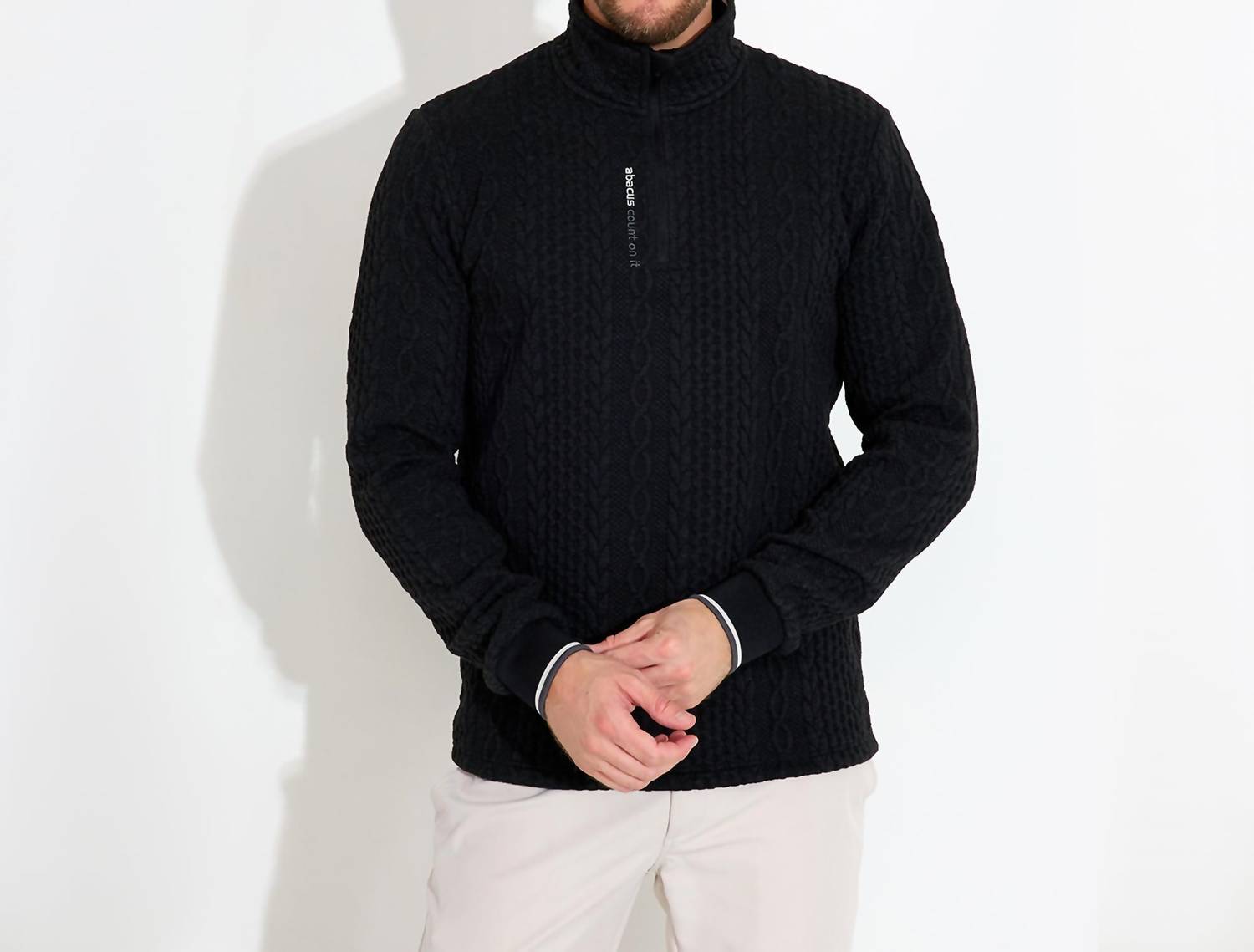 Layer under your favorite sweater or wear tucked into jeans for a perfectly polished winter look. Experience the comfort and style of the Abacus Sportswear US Woburn Midlayer Half Zip Sweater for men. This black long-sleeve knit sweater features a mockneck and a cable knit pattern for added texture. Designed with a zip closure, contrast colored details, and a bottom drawstring for a customizable fit, it's perfect for fall weather and Game Day occasions. Care: Machine wash and tumble dry.