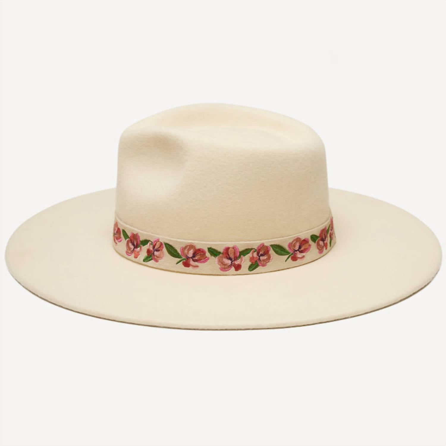 Turn heads in this stylish and chic hat. Not only is this accessory a must for keeping the sun out of your face, it will also be the perfect complement to any cute warm-weather outfit. Introducing the Rafaela Frida Wide Brim Hat by WYETH, a chic accessory in a cream hue that elevates any outfit. Crafted from 100% wool, this hat features a pinched crown and a wide 4" brim that exudes timeless elegance. The leather strap, embroidered with pink blossoms and green leaves, adds a touch of artistry reminiscent of Frida Kahlo's iconic style. Crown height is 5".