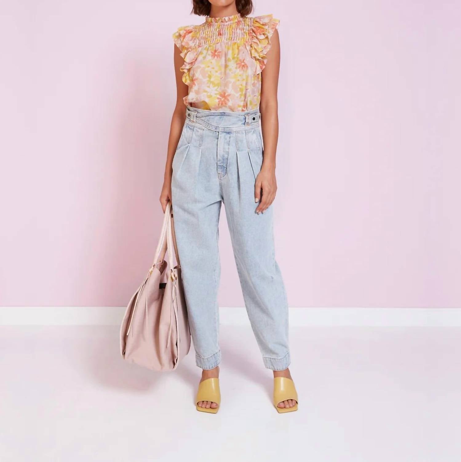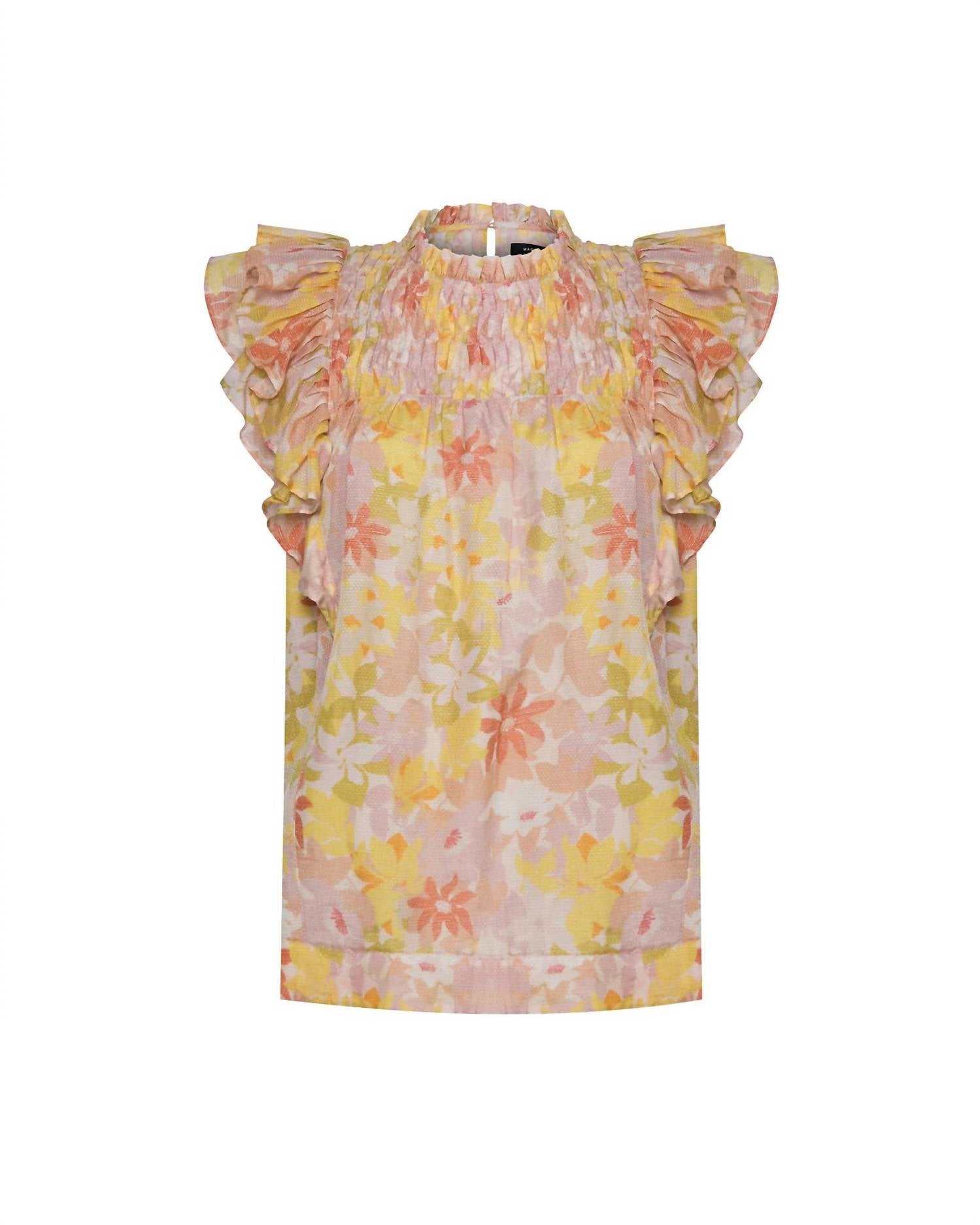 Crafted of a light floral-print cotton blend, the Joyce top from Magali Pascal features pintuck detailing across the chest and back. Layered ruffles at the shoulders finish this bright look. Band collar with back button closure. Flutter cap sleeves. Split sides. Pullover style. 70% cotton/30% silk. Hand wash. Imported.