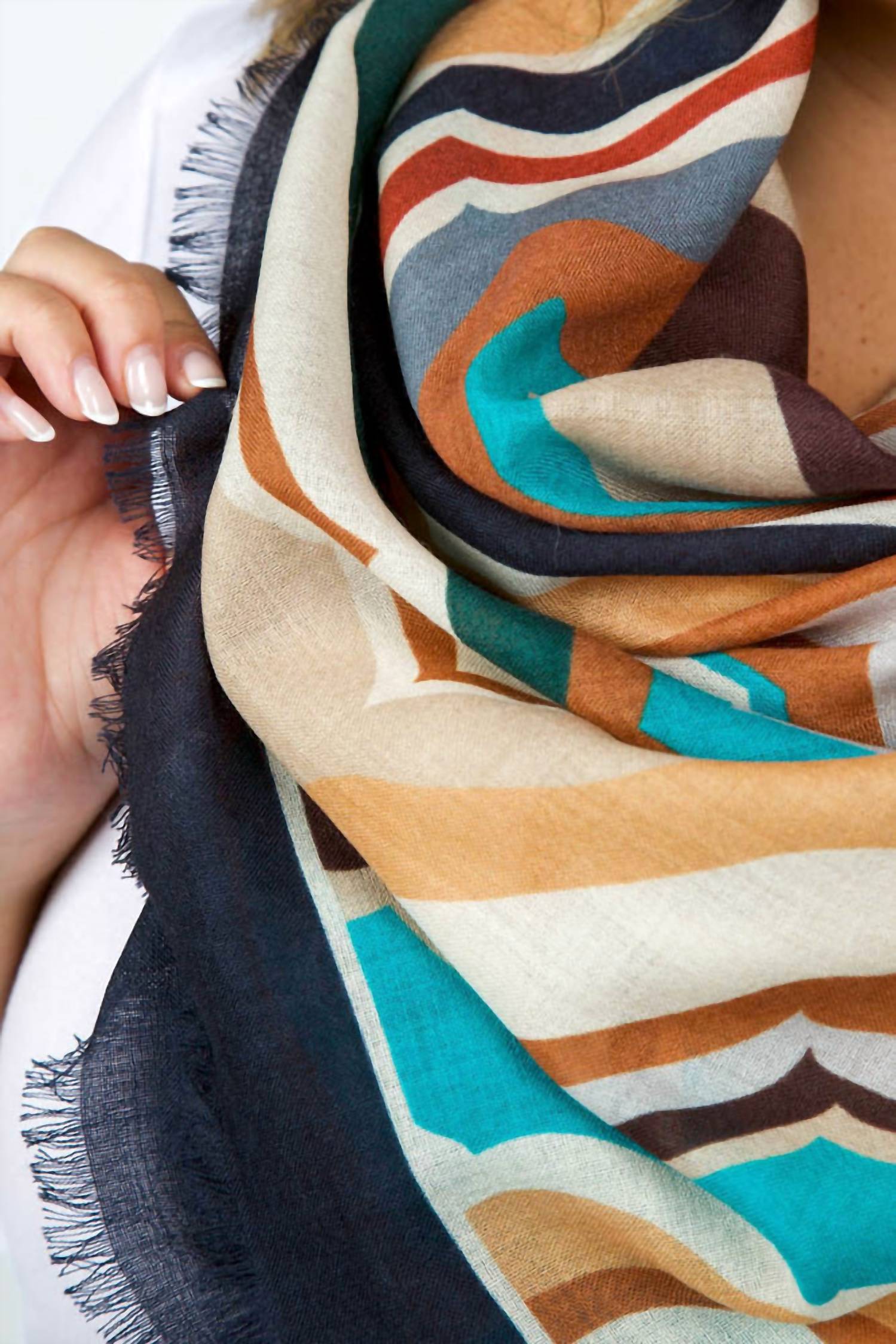 Add this to any outfit for a perfeclty polished look. The Echo Geode Wool Square Scarf is a stylish accessory designed to seamlessly transition from September to winter, offering warmth and a touch of sophistication. With its striking geode-inspired design, this oversized scarf measures an ample 50" x 50", perfect for wrapping or draping as desired. Crafted from high-quality wool, it provides both comfort and an elegant flair to any outfit. Made without a specified closure for versatile wear, this scarf is a must-have for any wardrobe.