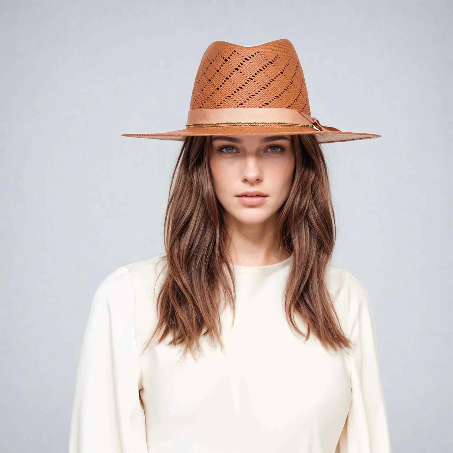 Block the sun in style with this adorable hat that will complement any outfit. Expertly crafted to elevate your style while providing a delightful touch of personality. Freya's Women's Sequoia Hat in a stunning pecan hue is the perfect addition to any outfit, whether it's a beach day or an evening event. This woven hat is elegantly adorned with a tan ribbon and a beaded gold accent band. Featuring a stretch band for a comfortable fit, it’s designed to stay securely in place.