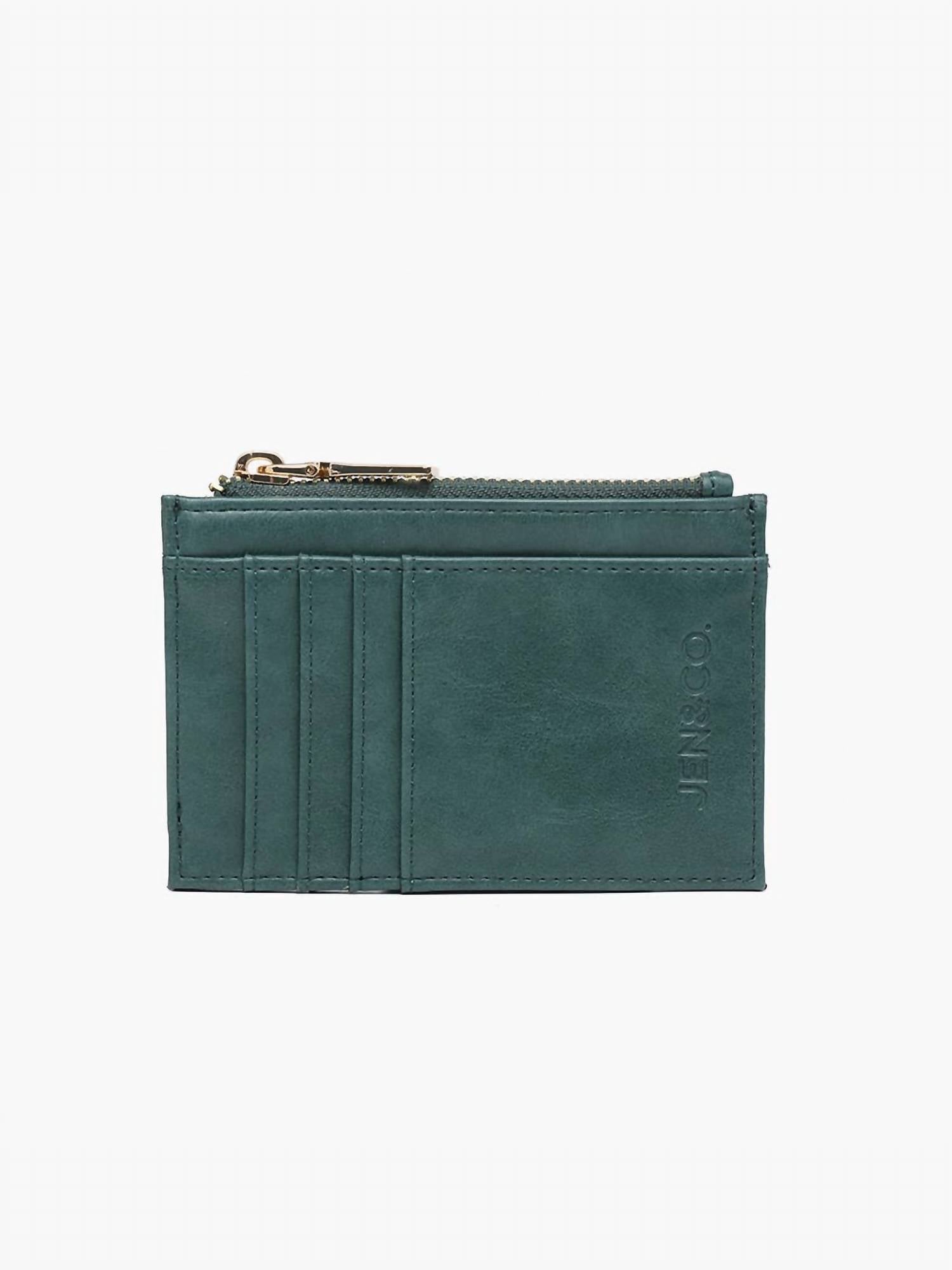Elevate your accessory game with this stylish must-have. Not only is it functional by keeping everything organized, but it's classic and timeless in its design. Introducing the Jen & Co. Women's Sia Printed Card Holder Wallet in a sophisticated Forest Green. Crafted from vegan leather, this compact wallet is both stylish and durable. Featuring a practical top zipper closure, it efficiently holds several cards, including an ID card slot. With dimensions of 5 inches in length, 3 inches in height, and 0.5 inches in depth, it's a perfect blend of convenience and design in your accessory collection.