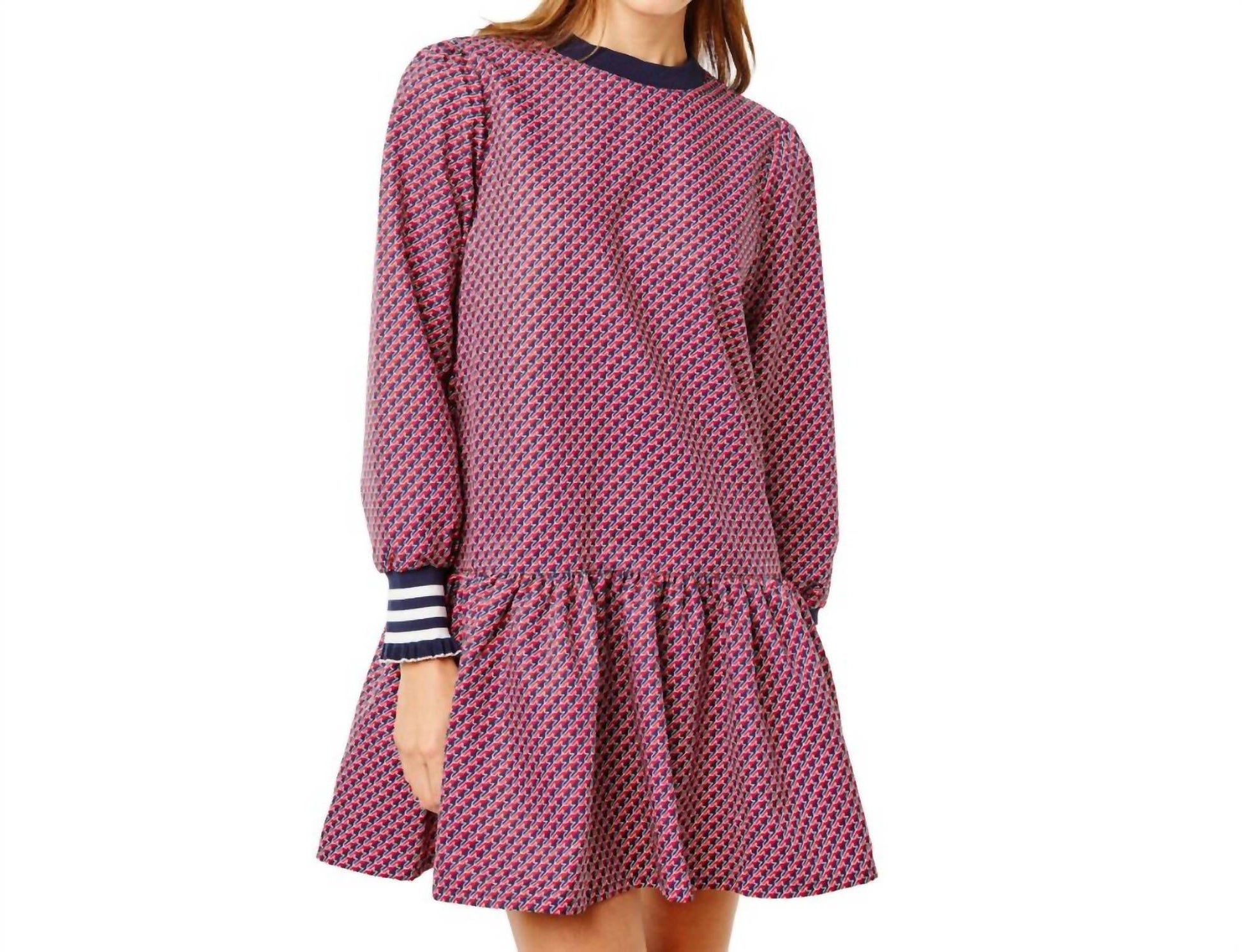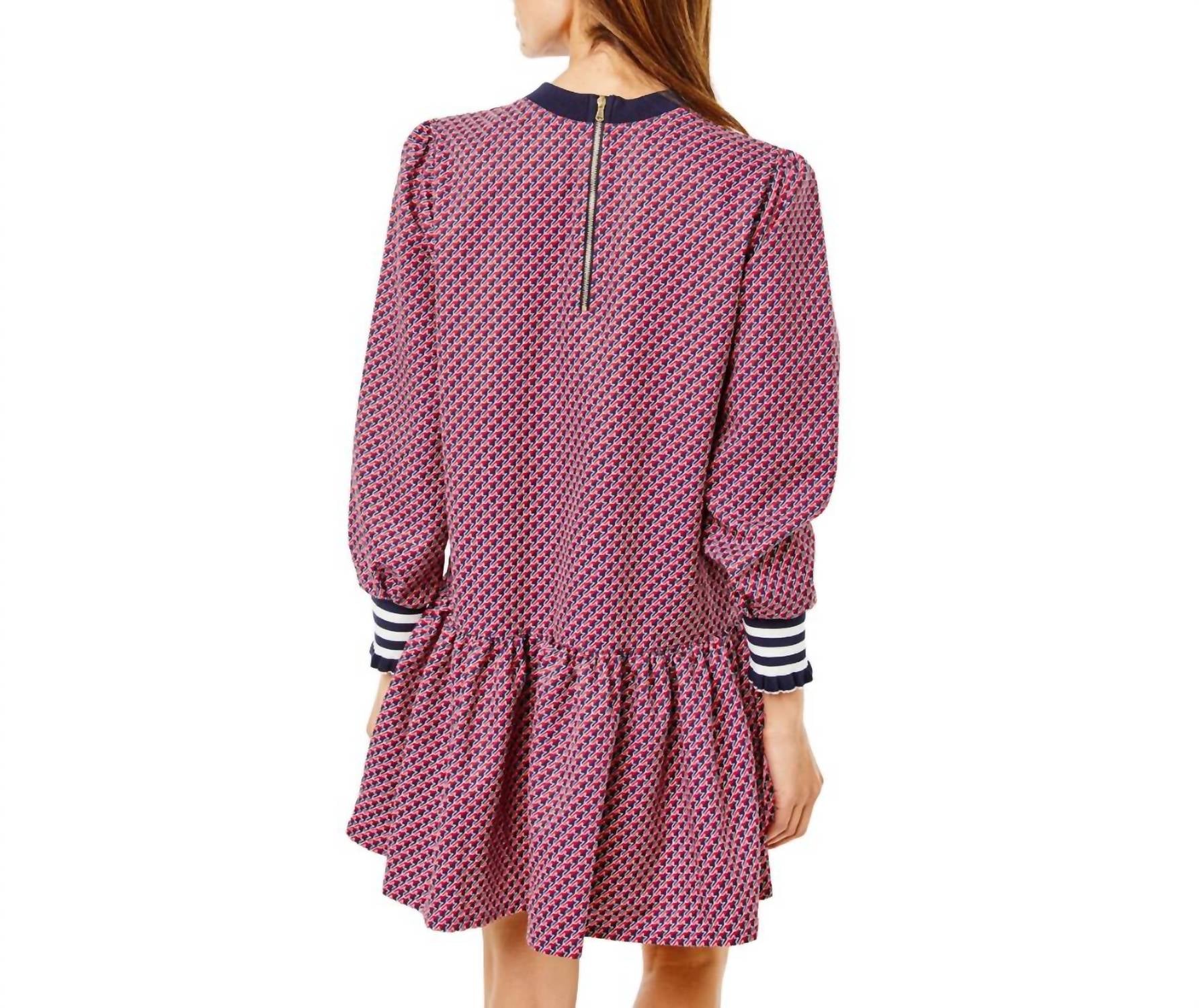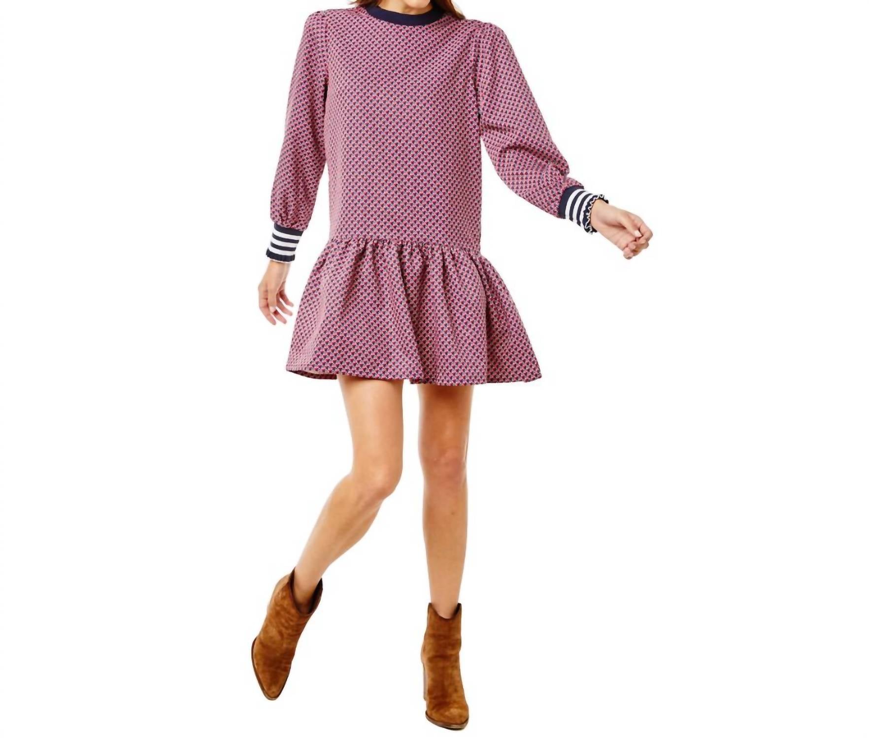 Vine Mini Dress. Long sleeve. Navy Cherry Stars color. Playful polka dot pattern. Swishy peplum hem. Ruffled cuffs. Gathered cap sleeves. Gold chunky zipper. Crewneck. Pull-on closure. Flattering A-line silhouette.