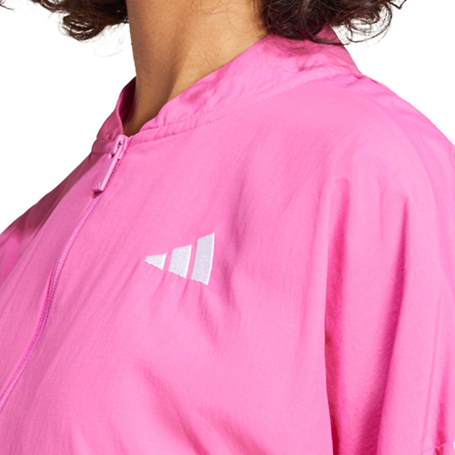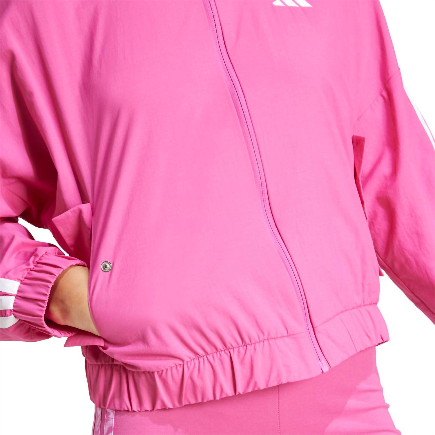 A riff on your favorite classic bomber jacket. Elevate your streetwear collection with the adidas Essentials 3-Stripes Lifestyle Woven Bomber Full Zip Jacket in a striking Semi Lucid Fuchsia. This bomber sports long sleeves and a full zip closure with a stand-up collar for a polished look. Crafted from 100% recycled polyamide, this piece is both sustainable and stylish. Designed with front pockets and elastic cuffs and hem, it ensures a comfortable, loose fit ideal for travel and spring outings.