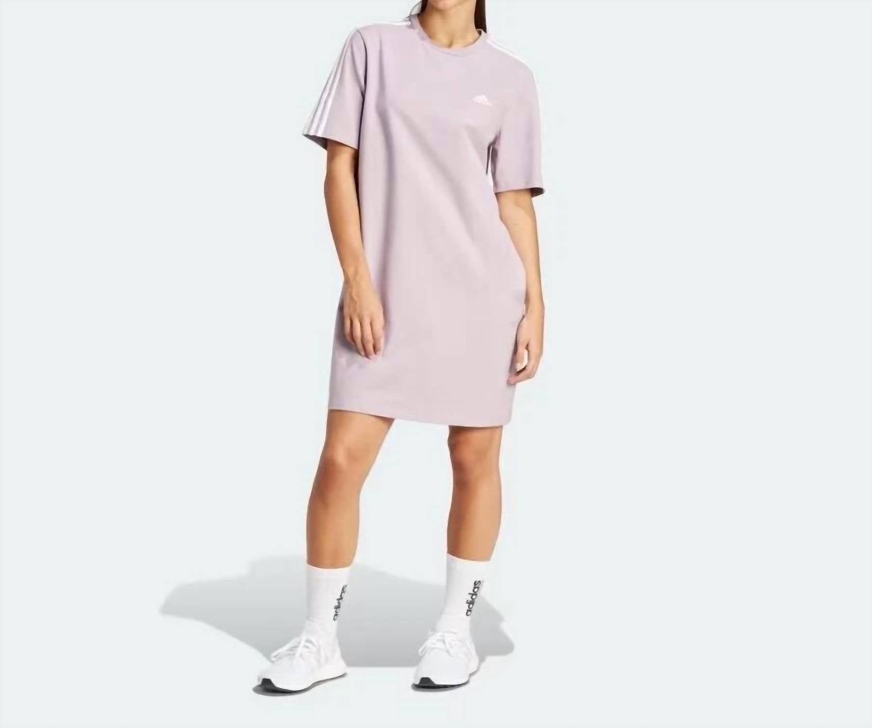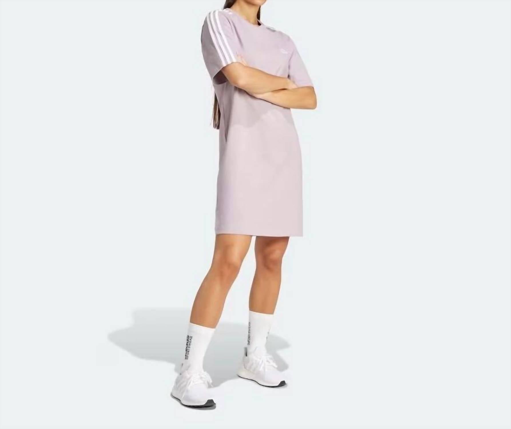 A short and breezy dress for those warmer days. Discover the Women's 3 Stripes Bf T Shirt Dress by adidas, a chic blend of athleisure inspired style and comfort. This mini dress features short sleeves and is crafted from polyester with a striking preloved fig/white stripe pattern, perfect for fitness or workout occasions. Designed for easy wear, it has a pull-on closure and a crewneck, offering a relaxed yet flattering fit. Care for this dress is simple with machine wash convenience, ensuring it remains a vibrant staple in your summer wardrobe. 100% Polyester.