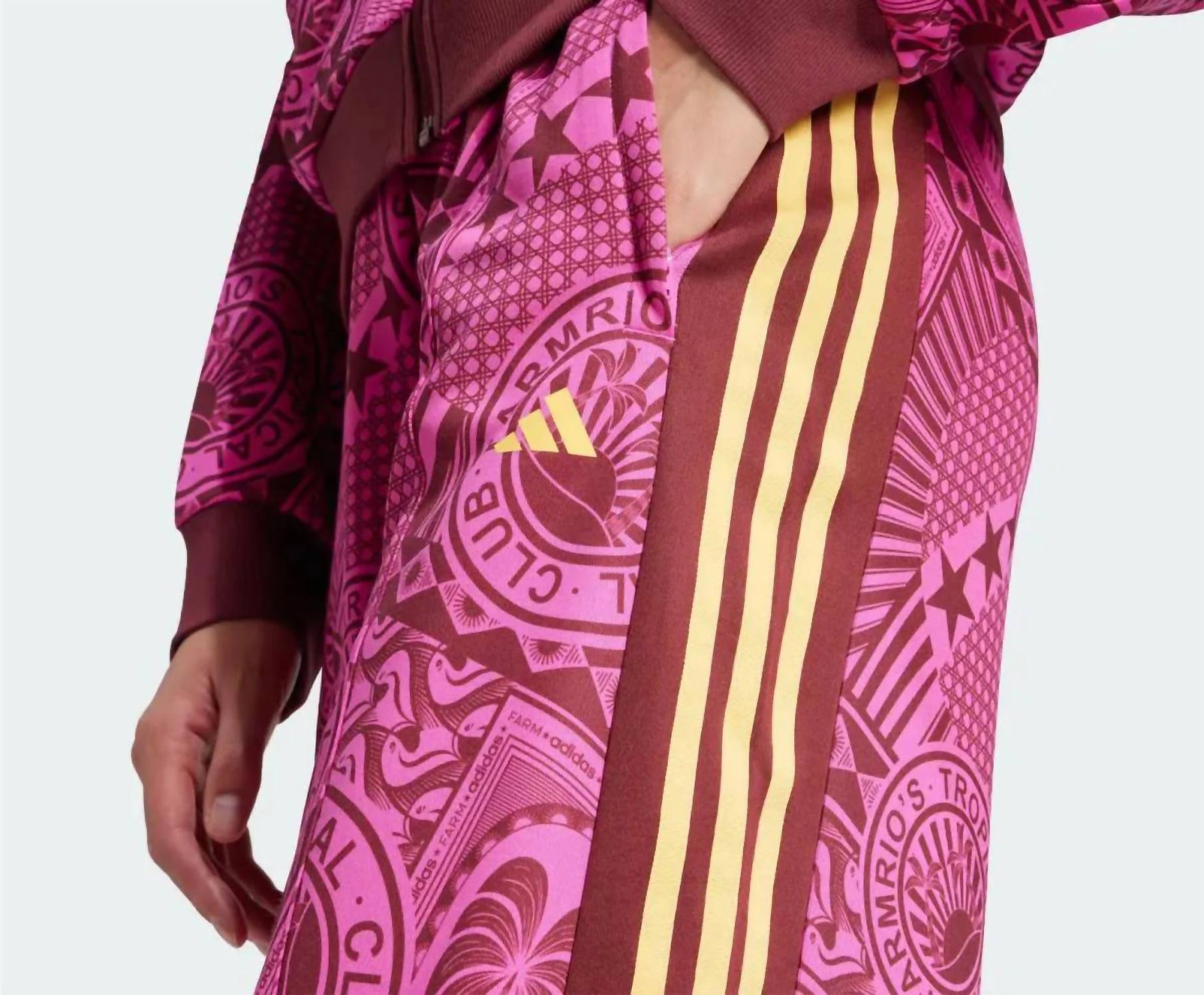 No gym necessary for these cool-girl joggers. Elevate your athleisure wardrobe with the Adidas X Farm Rio Track Pants, designed in a vibrant pink for standout style. Crafted from 70% recycled polyester and 30% cotton, these patterned track pants feature a relaxed, wide-leg fit with a comfortable high rise and a drawcord on the elastic waist for a personalized fit. Equipped with side pockets, these pull-on pants are perfect for fitness or casual outings. Care for them easily with machine wash instructions.